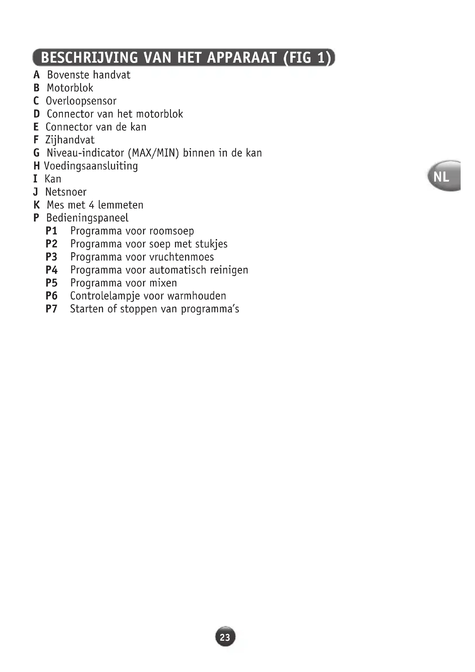 BESCHRIJVING VAN HET APPARAAT (FIG 1) A Bovenste handvat B Motorblok C Overloopsensor D Connector van het motorblok E Connector van de kan F Zijhandvat G Niveau-indicator (MAX/MIN) binnen in de kan H Voedingsaansluiting I Kan J Netsnoer K Mes met 4 lemmeten P Bedieningspaneel P1 Programma voor roomsoep P2 Programma voor soep met stukjes P3 Programma voor vruchtenmoes P4 Programma voor automatisch reinigen P5 Programma voor mixen P6 Controlelampje voor warmhouden P7 Starten of stoppen van programma’s24