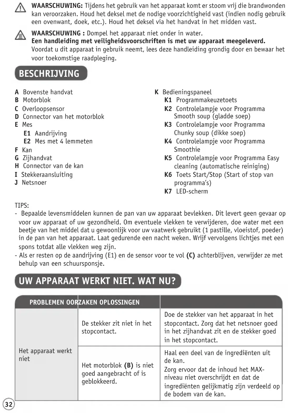 Het apparaat werkt niet De stekker zit niet in het stopcontact. Doe de stekker van het apparaat in het stopcontact. Zorg dat het netsnoer goed in het zijhandvat zit en de stekker goed in het stopcontact. Het motorblok (B) is niet goed aangebracht of is geblokkeerd. Haal een deel van de ingrediënten uit de kan. Zorg ervoor dat de inhoud het MAX- niveau niet overschrijdt en dat de ingrediënten gelijkmatig zijn verdeeld op de bodem van de kan. BESCHRIJVING A Bovenste handvat B Motorblok C Overloopsensor D Connector van het motorblok E Mes E1 Aandrijving E2 Mes met 4 lemmeten F Kan G Zijhandvat H Connector van de kan I Stekkeraansluiting J Netsnoer K Bedieningspaneel K1 Programmakeuzetoets K2 Controlelampje voor Programma Smooth soup (gladde soep) K3 Controlelampje voor Programma Chunky soup (dikke soep) K4 Controlelampje voor Programma Smoothie K5 Controlelampje voor Programma Easy cleaning (automatische reiniging) K6 Toets Start/Stop (Start of stop van programma’s) K7 LED-scherm TIPS: - Bepaalde levensmiddelen kunnen de pan van uw apparaat bevlekken. Dit levert geen gevaar op voor uw apparaat of uw gezondheid. Om eventuele vlekken te verwijderen, doe water met een beetje van het middel dat u gewoonlijk voor uw vaatwerk gebruikt (1 pastille, vloeistof, poeder) in de pan van het apparaat. Laat gedurende een nacht weken. Wrijf vervolgens lichtjes met een spons totdat alle vlekken weg zijn. - Als er resten op de aandrijving (E1) en de sensor voor te vol (C) achterblijven, verwijder ze met behulp van een schuursponsje. WAARSCHUWING: Tijdens het gebruik van het apparaat komt er stoom vrij die brandwonden kan veroorzaken. Houd het deksel met de nodige voorzichtigheid vast (indien nodig gebruik een ovenwant, doek, etc.). Houd het deksel via het handvat in het midden vast. WAARSCHUWING : Dompel het apparaat niet onder in water. Een handleiding met veiligheidsvoorschriften is met uw apparaat meegeleverd. Voordat u dit apparaat in gebruik neemt, lees deze handleiding grondig door en bewaar het voor toekomstige raadpleging.33