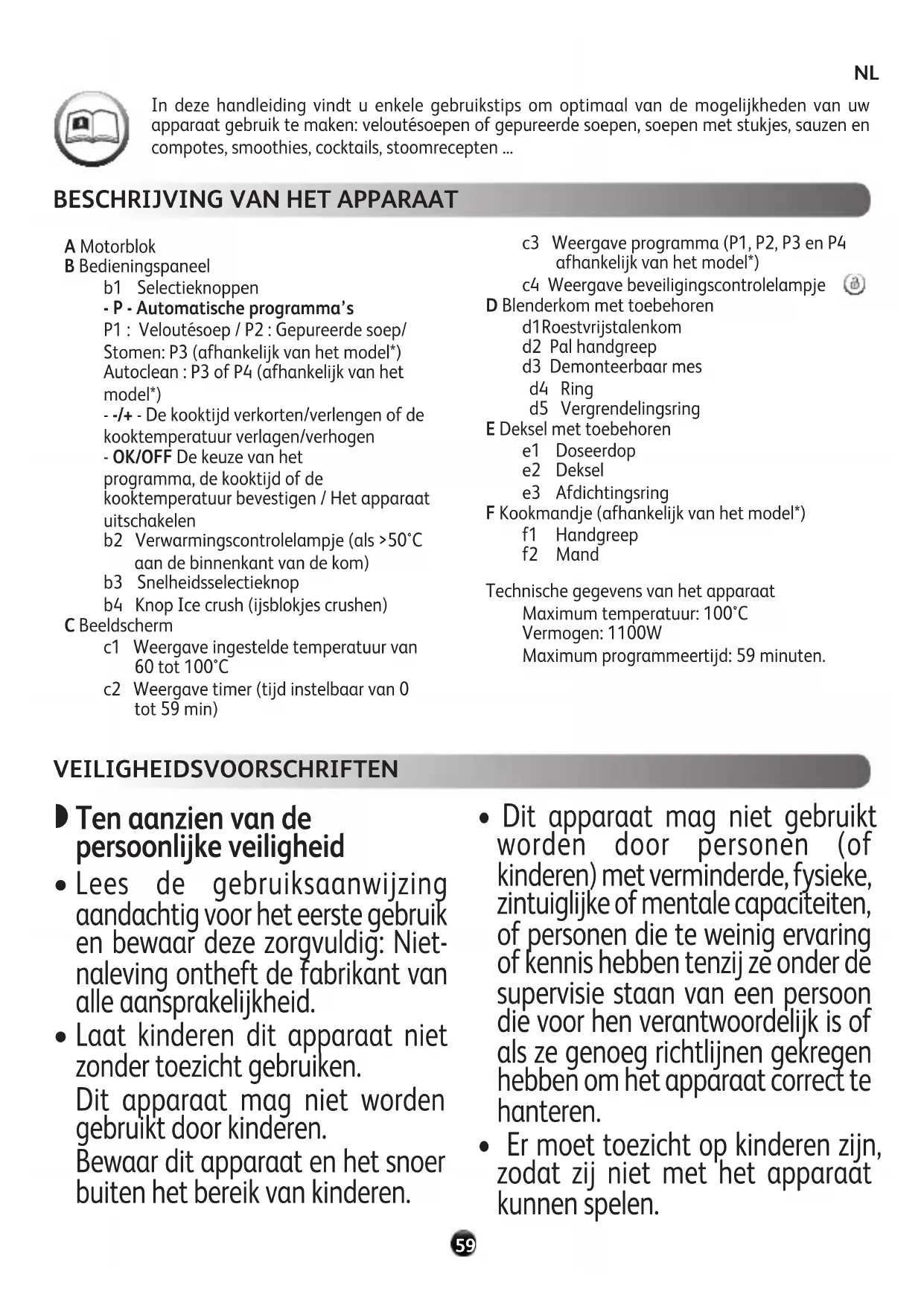 A Motorblok B Bedieningspaneel b1 Selectieknoppen - P - Automatische programma’s P1 : Veloutésoep / P2 : Gepureerde soep/ Stomen: P3 (afhankelijk van het model*) Autoclean : P3 of P4 (afhankelijk van het model*) - -/+ - De kooktijd verkorten/verlengen of de kooktemperatuur verlagen/verhogen - OK/OFF De keuze van het programma, de kooktijd of de kooktemperatuur bevestigen / Het apparaat uitschakelen b2 Verwarmingscontrolelampje (als >50°C aan de binnenkant van de kom) b3 Snelheidsselectieknop b4 Knop Ice crush (ijsblokjes crushen) C Beeldscherm c1 Weergave ingestelde temperatuur van 60 tot 100°C c2 Weergave timer (tijd instelbaar van 0 tot 59 min) c3 Weergave programma (P1, P2, P3 en P4 afhankelijk van het model*) c4 Weergave beveiligingscontrolelampje STARTSTART D Blenderkom met toebehoren d1 Roestvrijstalen kom d2 Pal handgreep d3 Demonteerbaar mes d4 Ring d5 Vergrendelingsring E Deksel met toebehoren e1 Doseerdop e2 Deksel e3 Afdichtingsring F Kookmandje (afhankelijk van het model*) f1 Handgreep f2 Mand Technische gegevens van het apparaat Maximum temperatuur: 100°C Vermogen: 1100W Maximum programmeertijd: 59 minuten. In deze handleiding vindt u enkele gebruikstips om optimaal van de mogelijkheden van uw apparaat gebruik te maken: veloutésoepen of gepureerde soepen, soepen met stukjes, sauzen en compotes, smoothies, cocktails, stoomrecepten ...