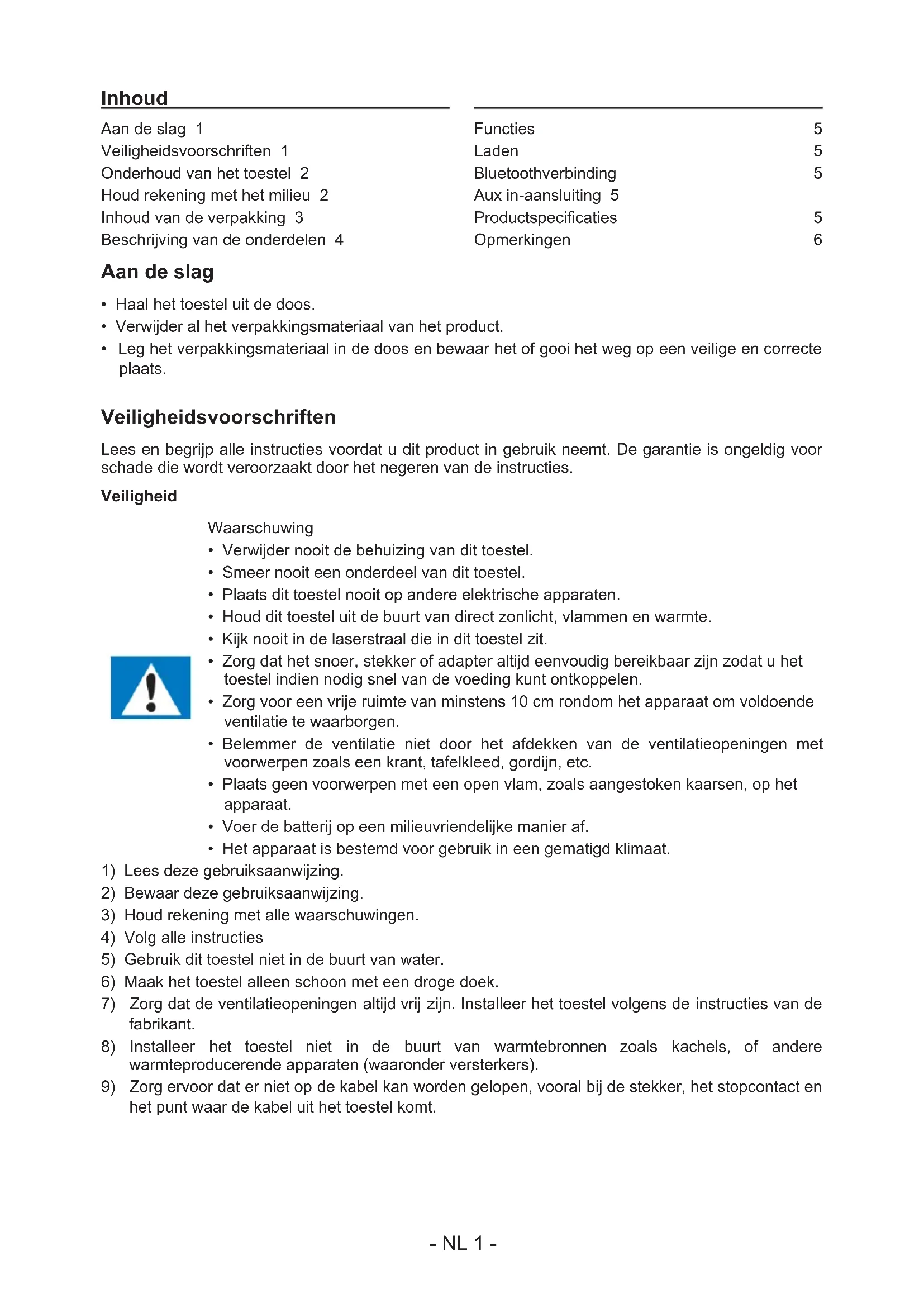het punt waar de kabel uit het toestel komt. Inhoud Aan de slag 1 Veiligheidsvoorschriften 1 Onderhoud van het toestel 2 Houd rekening met het milieu 2 Inhoud van de verpakking 3 Beschrijving van de onderdelen 4 Functies: 5 Laden: 5 Bluetoothverbinding: 5 Aux in-aansluiting 5 Productspecicaties 5 Opmerkingen: 6- NL 2 -