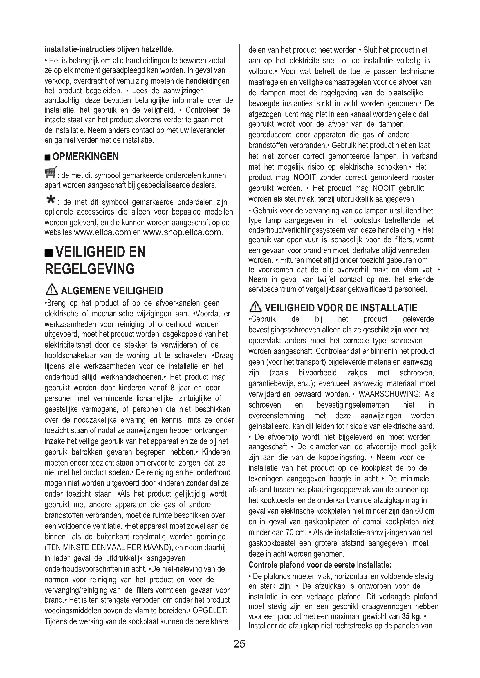 - Het is belangrijk om alle handleidingen te bewaren zodat ze op elk moment geraadpleegd kan worden. In geval van verkoop, overdracht of verhuizing moeten de handleidingen het product begeleiden. • Lees de aanwijzingen aandachtig: deze bevatten belangrijke informatie over de installatie, het gebruik en de veiligheid. • Controleer de intacte staat van het product alvorens verder te gaan met de installatie. Neem anders contact op met uw leverancier en ga niet verder met de installatie. OPMERKINGEN : de met dit symbool gemarkeerde onderdelen kunnen apart worden aangeschaft bij gespecialiseerde dealers. : de met dit symbool gemarkeerde onderdelen zijn optionele accessoires die alleen voor bepaalde modellen worden geleverd, en die kunnen worden aangeschaft op de websites www.elica.com en www.shop.elica.com. VEILIGHEID EN REGELGEVING ALGEMENE VEILIGHEID