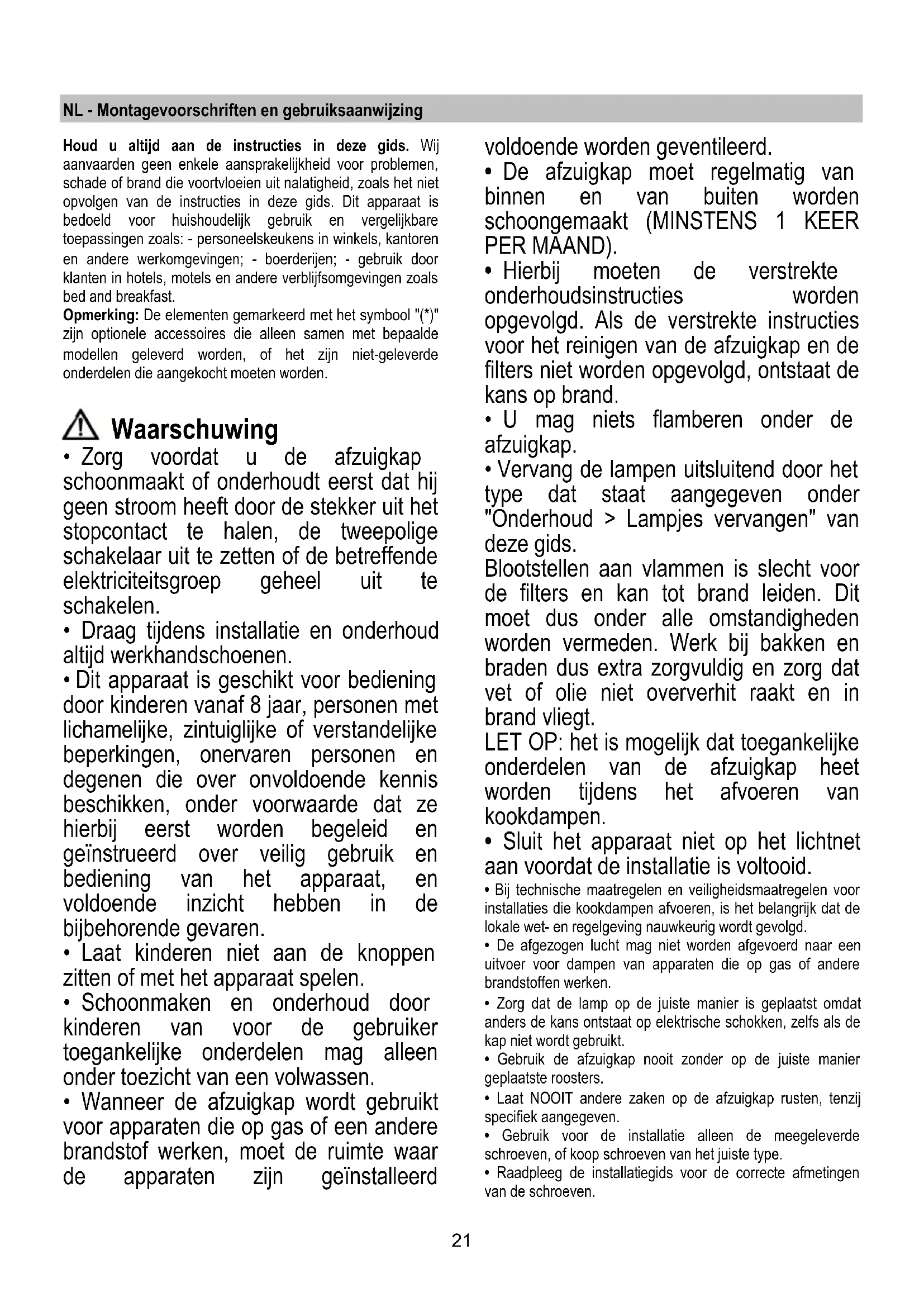 - De afzuigkap moet regelmatig van binnen en van buiten worden schoongemaakt (MINSTENS 1 KEER PER MAAND).