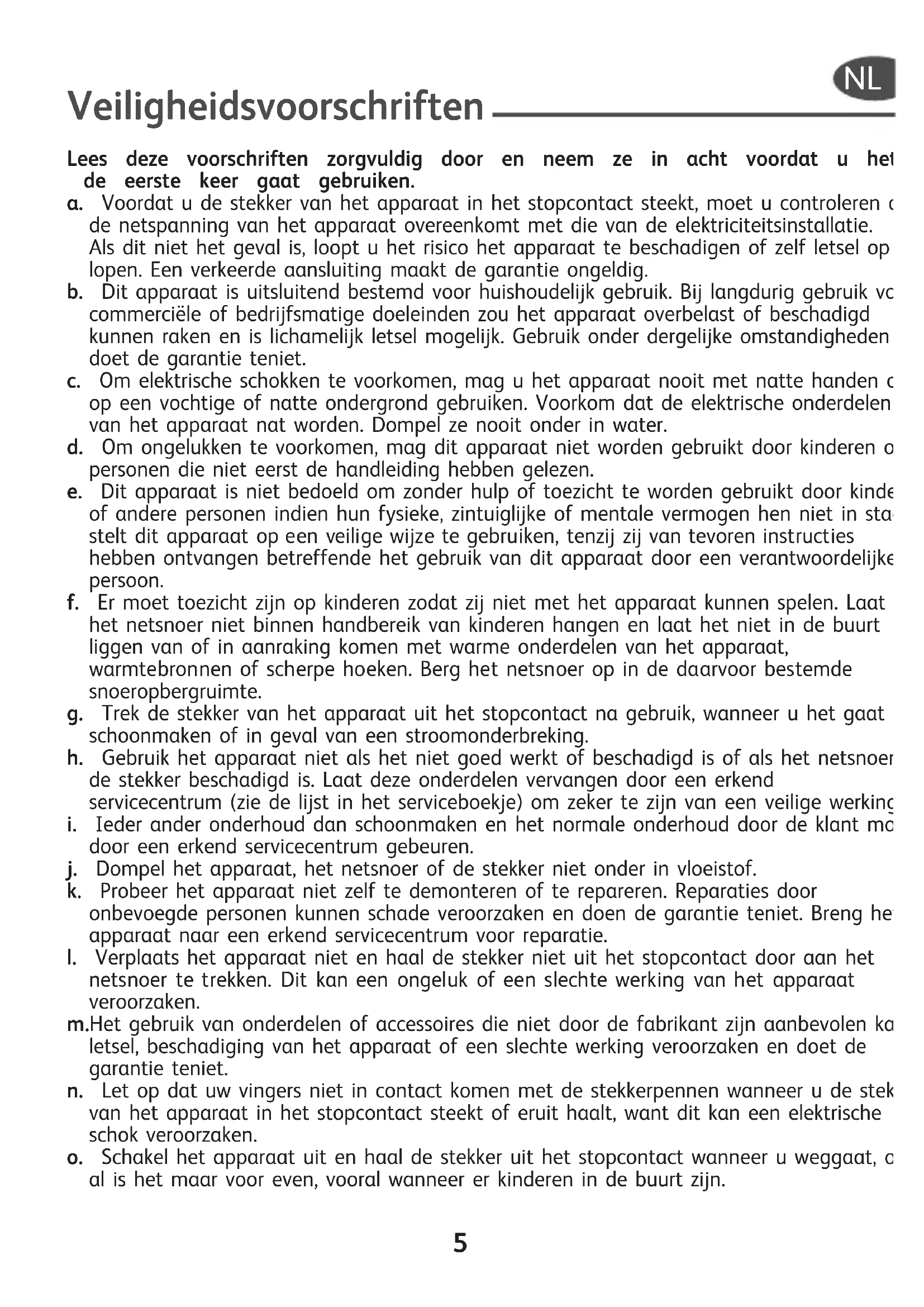 Participons à la protection de l’environnement ! Votre appareil contient de nombreux matériaux valorisables ou recyclables. Confiez celui-ci dans un point de collecte ou à défaut dans un centre service agréé pour que son traitement soit effectué.5 Veiligheidsvoorschriften Lees deze voorschriften zorgvuldig door en neem ze in acht voordat u het apparaat voor de eerste keer gaat gebruiken. a. Voordat u de stekker van het apparaat in het stopcontact steekt, moet u controleren of de netspanning van het apparaat overeenkomt met die van de elektriciteitsinstallatie. Als dit niet het geval is, loopt u het risico het apparaat te beschadigen of zelf letsel op te lopen. Een verkeerde aansluiting maakt de garantie ongeldig. b. Dit apparaat is uitsluitend bestemd voor huishoudelijk gebruik. Bij langdurig gebruik voor commerciële of bedrijfsmatige doeleinden zou het apparaat overbelast of beschadigd kunnen raken en is lichamelijk letsel mogelijk. Gebruik onder dergelijke omstandigheden doet de garantie teniet. c. Om elektrische schokken te voorkomen, mag u het apparaat nooit met natte handen of op een vochtige of natte ondergrond gebruiken. Voorkom dat de elektrische onderdelen van het apparaat nat worden. Dompel ze nooit onder in water. d. Om ongelukken te voorkomen, mag dit apparaat niet worden gebruikt door kinderen of personen die niet eerst de handleiding hebben gelezen. e. Dit apparaat is niet bedoeld om zonder hulp of toezicht te worden gebruikt door kinderen of andere personen indien hun fysieke, zintuiglijke of mentale vermogen hen niet in staat stelt dit apparaat op een veilige wijze te gebruiken, tenzij zij van tevoren instructies hebben ontvangen betreffende het gebruik van dit apparaat door een verantwoordelijke persoon. f. Er moet toezicht zijn op kinderen zodat zij niet met het apparaat kunnen spelen. Laat het netsnoer niet binnen handbereik van kinderen hangen en laat het niet in de buurt liggen van of in aanraking komen met warme onderdelen van het apparaat, warmtebronnen of scherpe hoeken. Berg het netsnoer op in de daarvoor bestemde snoeropbergruimte. g. Trek de stekker van het apparaat uit het stopcontact na gebruik, wanneer u het gaat schoonmaken of in geval van een stroomonderbreking. h. Gebruik het apparaat niet als het niet goed werkt of beschadigd is of als het netsnoer of de stekker beschadigd is. Laat deze onderdelen vervangen door een erkend servicecentrum (zie de lijst in het serviceboekje) om zeker te zijn van een veilige werking.