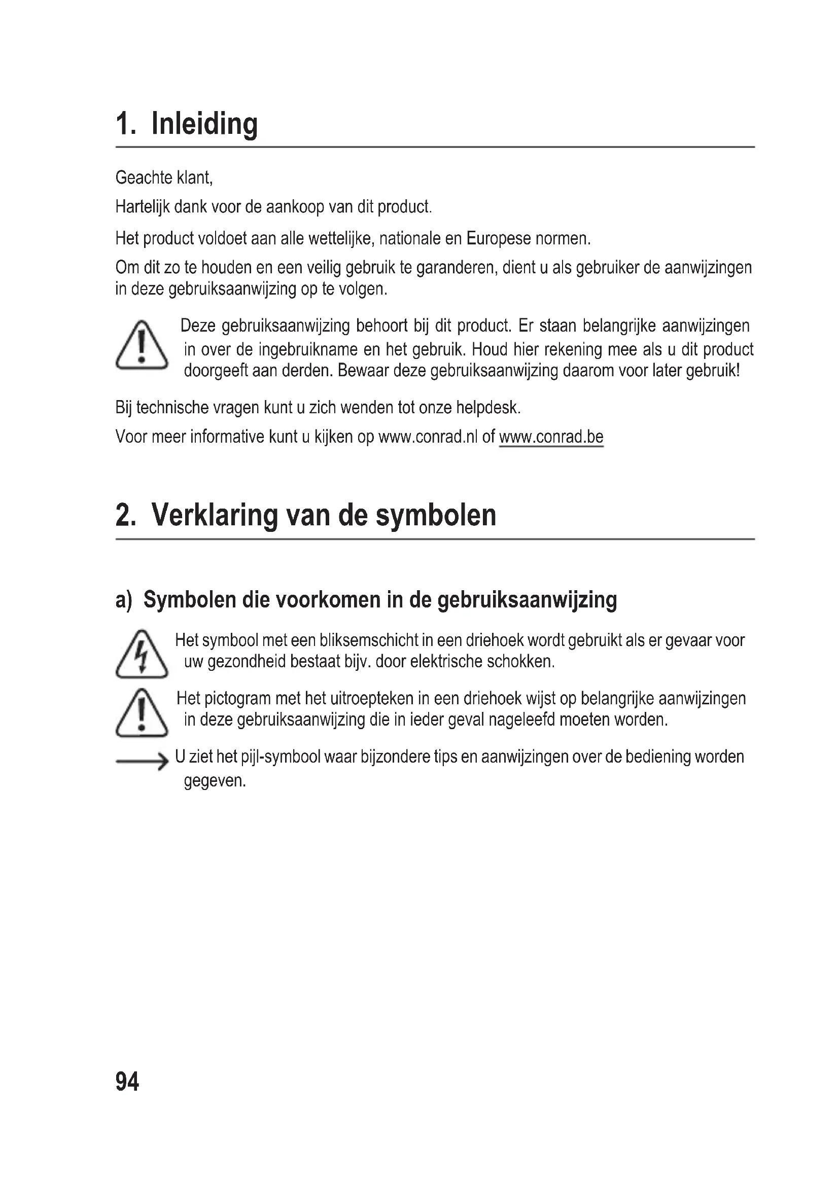 Geachte klant, Hartelijk dank voor de aankoop van dit product. Het product voldoet aan alle wettelijke, nationale en Europese normen. Om dit zo te houden en een veilig gebruik te garanderen, dient u als gebruiker de aanwijzingen in deze gebruiksaanwijzing op te volgen. Deze gebruiksaanwijzing behoort bij dit product. Er staan belangrijke aanwijzingen in over de ingebruikname en het gebruik. Houd hier rekening mee als u dit product doorgeeft aan derden. Bewaar deze gebruiksaanwijzing daarom voor later gebruik! Bij technische vragen kunt u zich wenden tot onze helpdesk. Voor meer informative kunt u kijken op www.conrad.nl of www.conrad.be