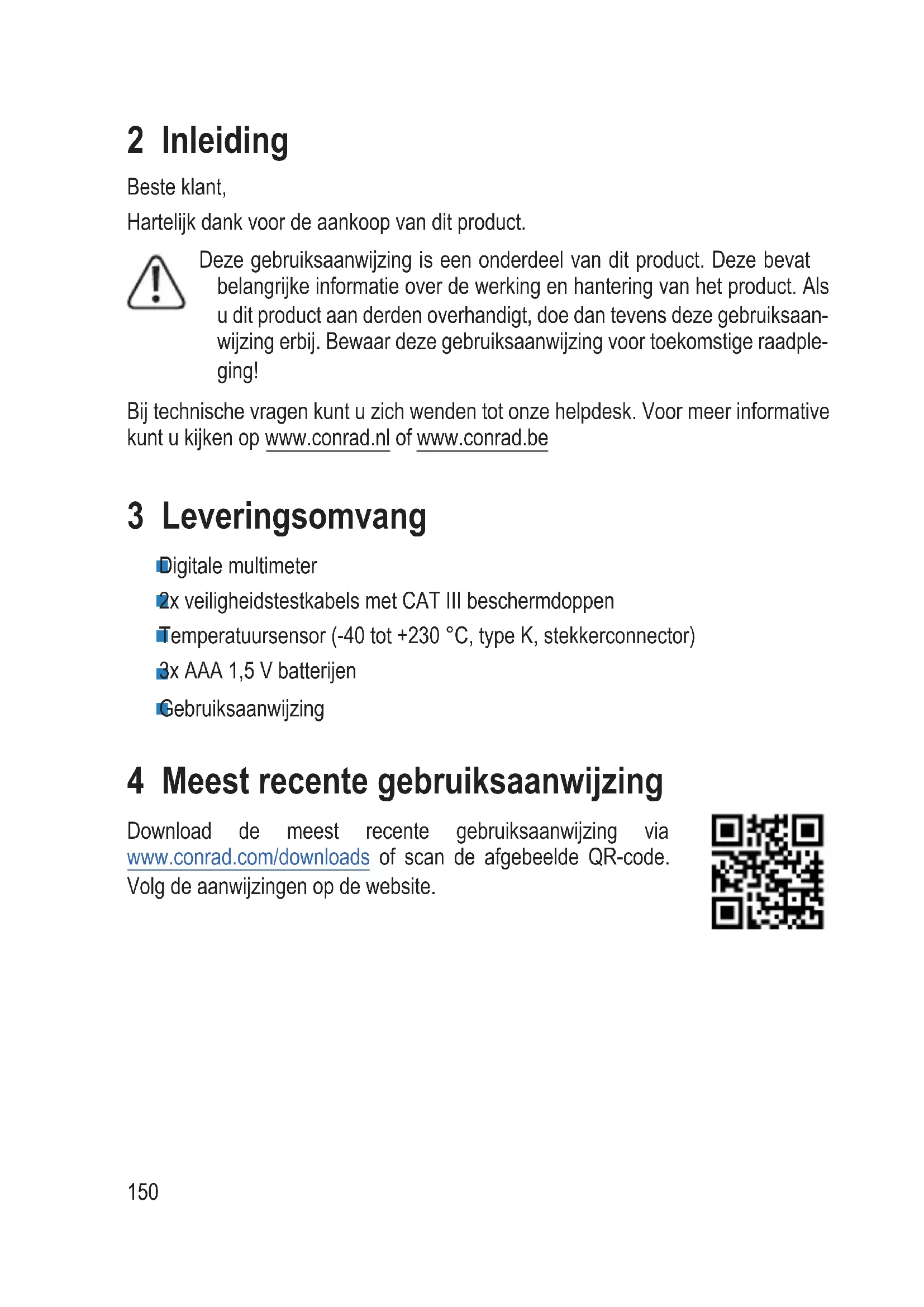16 Probleemoplossing ....................................................................................187 17 Technische gegevens ................................................................................188150 2 Inleiding Beste klant, Hartelijk dank voor de aankoop van dit product. Deze gebruiksaanwijzing is een onderdeel van dit product. Deze bevat belangrijke informatie over de werking en hantering van het product. Als u dit product aan derden overhandigt, doe dan tevens deze gebruiksaan- wijzing erbij. Bewaar deze gebruiksaanwijzing voor toekomstige raadple- ging! Bij technische vragen kunt u zich wenden tot onze helpdesk. Voor meer informative kunt u kijken op www.conrad.nl of www.conrad.be 3 Leveringsomvang