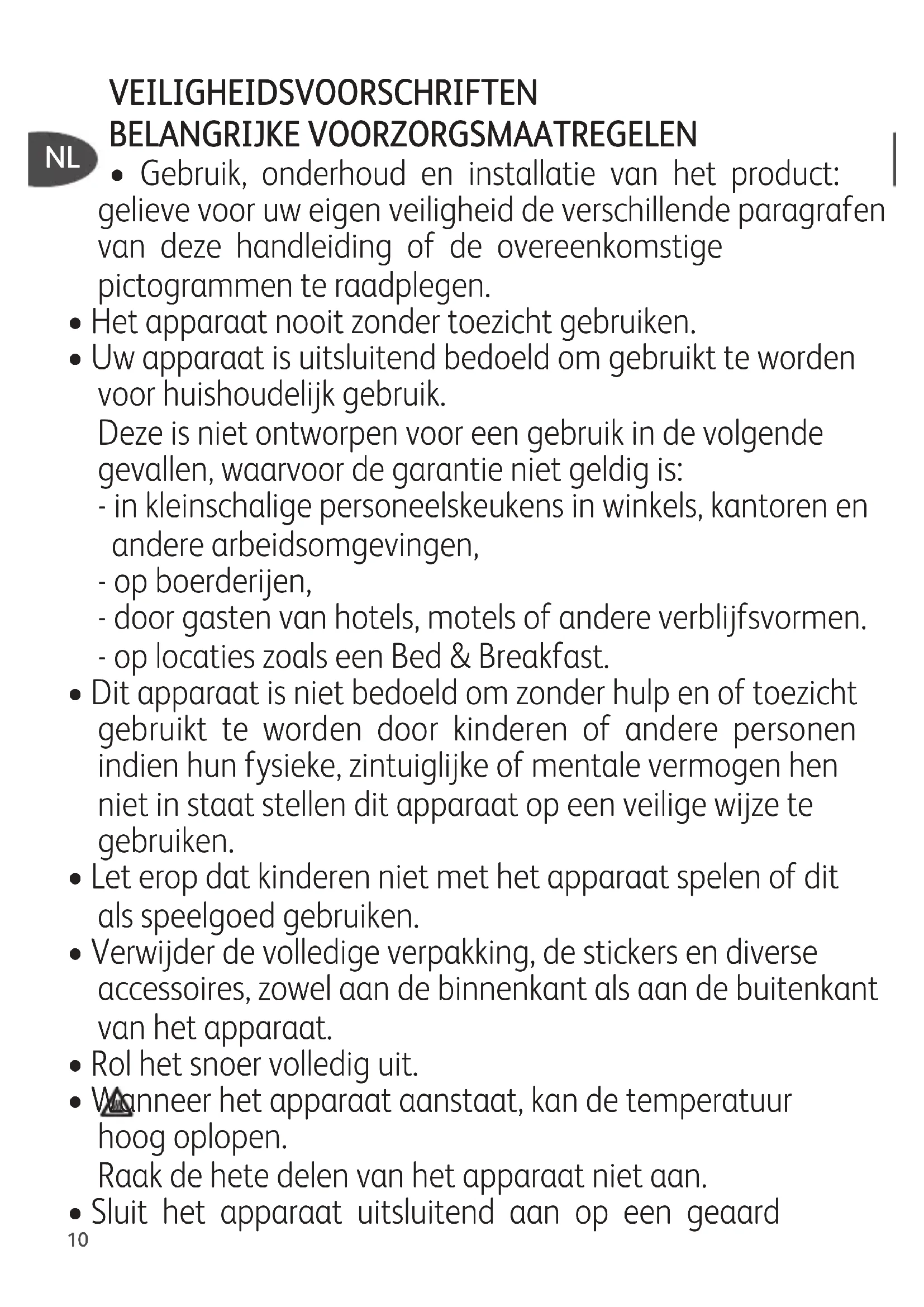 - Dit apparaat mag worden gebruikt door kinderen vanaf 8 jaar, op voorwaarde dat zij onder toezicht staan of instructies hebben gekregen betreffende het veilige gebruik van het apparaat en op de hoogte zijn van de risico's waaraan zij zijn blootgesteld. De reiniging en het onderhoud mogen niet door kinderen worden uitgevoerd tenzij ze ouder zijn dan 8 jaar en onder het toezicht staan van een volwassene. Bewaar het apparaat en snoer buiten het bereik van kinderen jonger dan 8 jaar.