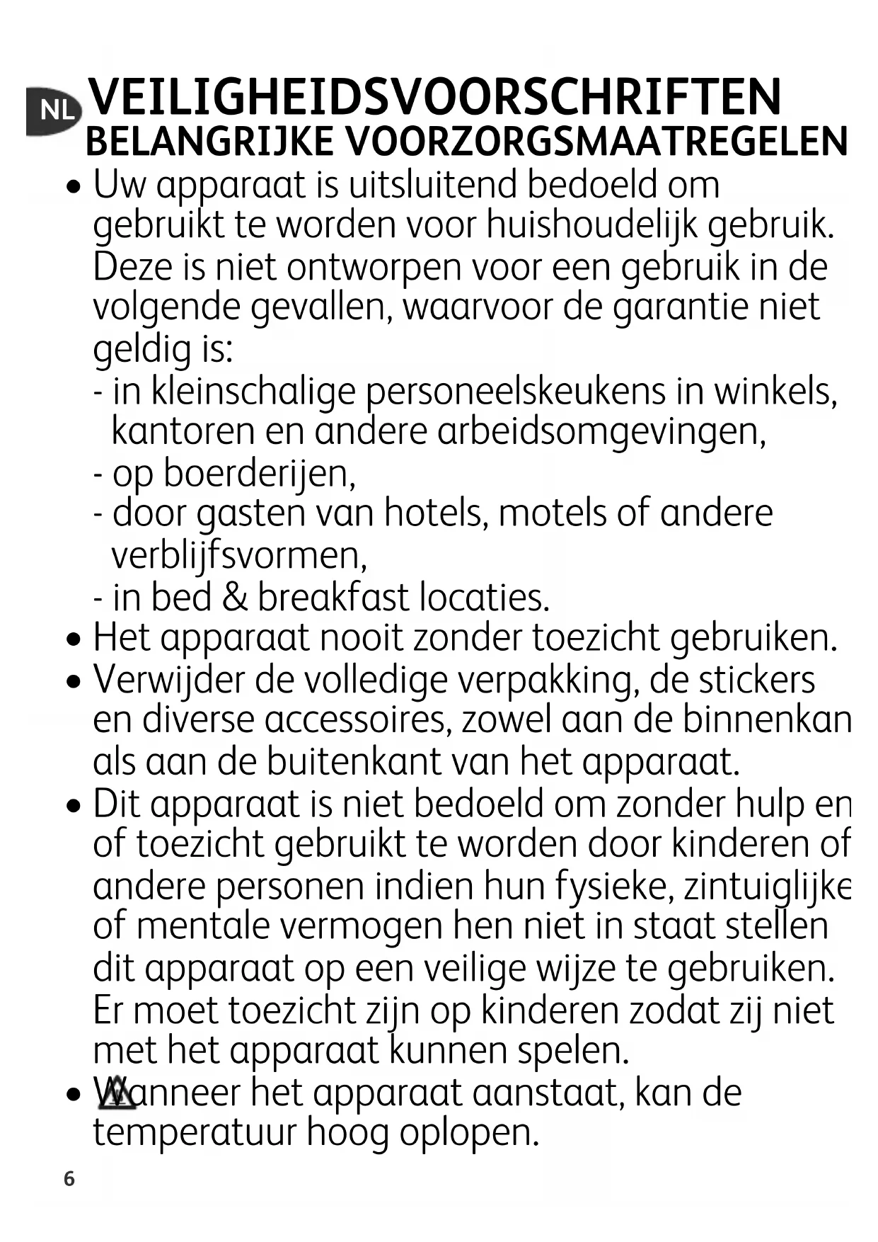 - Uw apparaat is uitsluitend bedoeld om gebruikt te worden voor huishoudelijk gebruik. Deze is niet ontworpen voor een gebruik in de volgende gevallen, waarvoor de garantie niet geldig is: - in kleinschalige personeelskeukens in winkels, kantoren en andere arbeidsomgevingen, - op boerderijen, - door gasten van hotels, motels of andere verblijfsvormen, - in bed & breakfast locaties.
