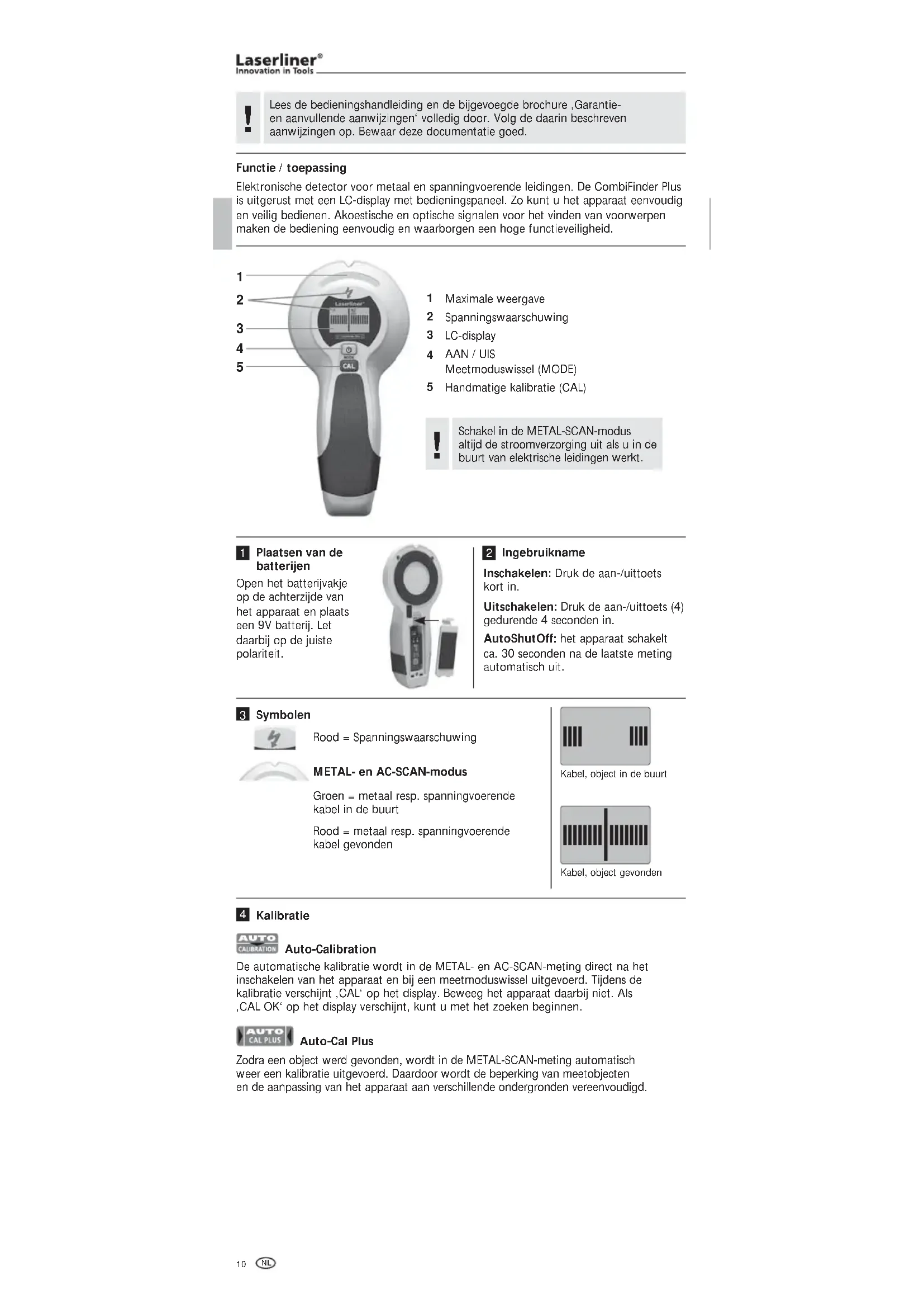 Elektronische detector voor metaal en spanningvoerende leidingen. De CombiFinder Plus is uitgerust met een LC-display met bedieningspaneel. Zo kunt u het apparaat eenvoudig en veilig bedienen. Akoestische en optische signalen voor het vinden van voorwerpen maken de bediening eenvoudig en waarborgen een hoge functieveiligheid. Maximale weergave Spanningswaarschuwing LC-display AAN / UIS Meetmoduswissel (MODE) Handmatige kalibratie (CAL) Open het batterijvakje op de achterzijde van het apparaat en plaats een 9V batterij. Let daarbij op de juiste polariteit. Plaatsen van de batterijen Inschakelen: Druk de aan-/uittoets kort in. Uitschakelen: Druk de aan-/uittoets (4) gedurende 4 seconden in. AutoShutOff: het apparaat schakelt ca. 30 seconden na de laatste meting automatisch uit. Ingebruikname Auto-Calibration De automatische kalibratie wordt in de METAL- en AC-SCAN-meting direct na het inschakelen van het apparaat en bij een meetmoduswissel uitgevoerd. Tijdens de kalibratie verschijnt ‚CAL‘ op het display. Beweeg het apparaat daarbij niet. Als ‚CAL OK‘ op het display verschijnt, kunt u met het zoeken beginnen. Auto-Cal Plus Zodra een object werd gevonden, wordt in de METAL-SCAN-meting automatisch weer een kalibratie uitgevoerd. Daardoor wordt de beperking van meetobjecten en de aanpassing van het apparaat aan verschillende ondergronden vereenvoudigd. Kalibratie Schakel in de METAL-SCAN-modus altijd de stroomverzorging uit als u in de buurt van elektrische leidingen werkt.