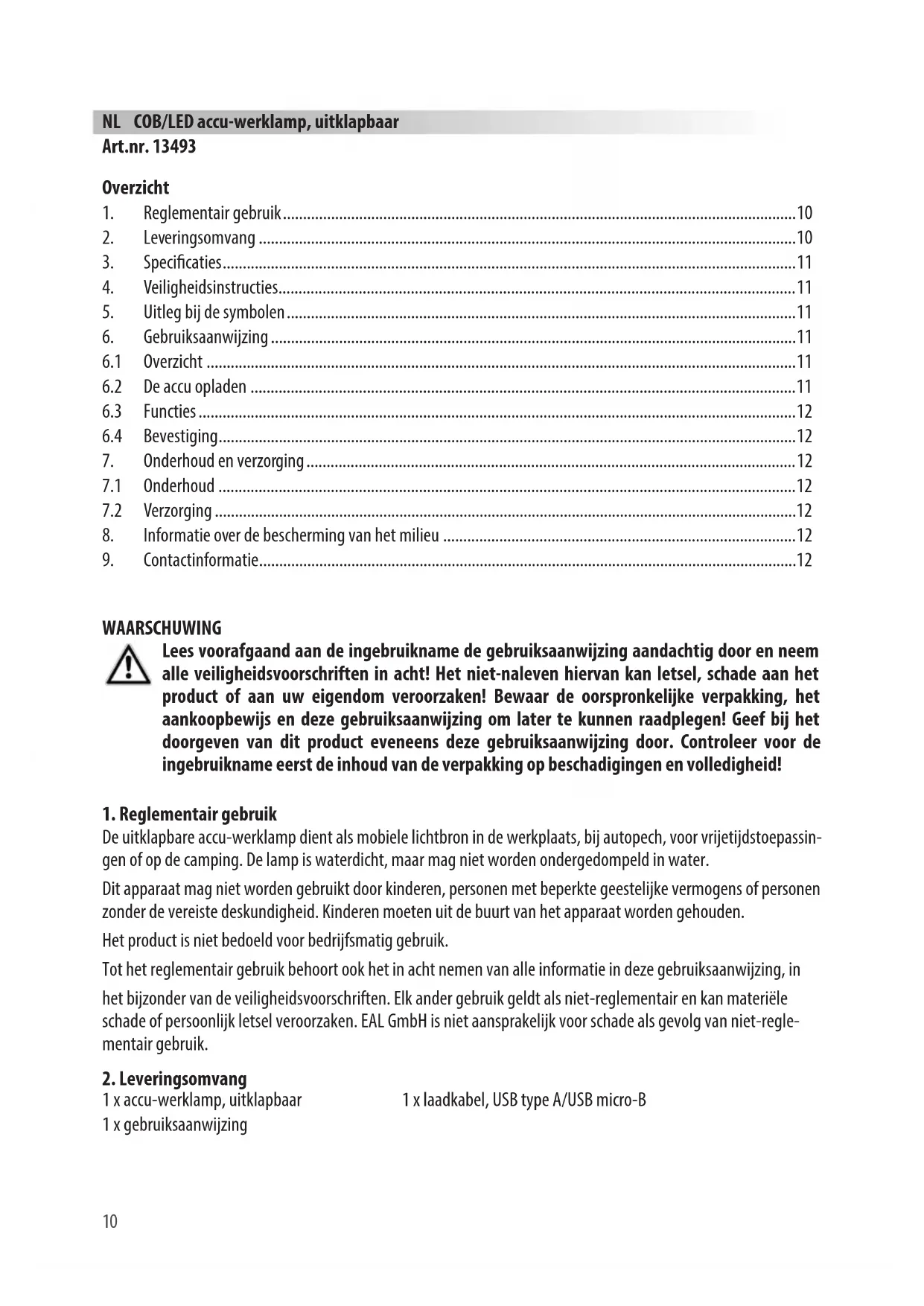 De uitklapbare accu-werklamp dient als mobiele lichtbron in de werkplaats, bij autopech, voor vrijetijdstoepassin- gen of op de camping. De lamp is waterdicht, maar mag niet worden ondergedompeld in water. Dit apparaat mag niet worden gebruikt door kinderen, personen met beperkte geestelijke vermogens of personen zonder de vereiste deskundigheid. Kinderen moeten uit de buurt van het apparaat worden gehouden. Het product is niet bedoeld voor bedrijfsmatig gebruik. Tot het reglementair gebruik behoort ook het in acht nemen van alle informatie in deze gebruiksaanwijzing, in het bijzonder van de veiligheidsvoorschriften. Elk ander gebruik geldt als niet-reglementair en kan materiële schade of persoonlijk letsel veroorzaken. EAL GmbH is niet aansprakelijk voor schade als gevolg van niet-regle- mentair gebruik. 1 x accu-werklamp, uitklapbaar 1 x gebruiksaanwijzing 1 x laadkabel, USB type A/USB micro-B