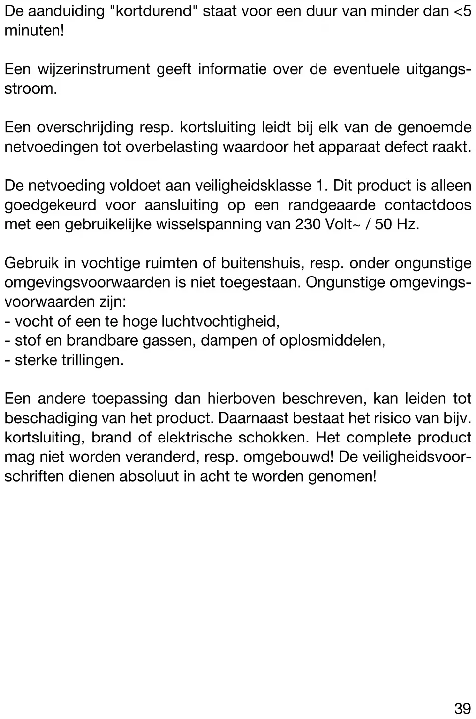 - Technische gegevens Voorgeschreven gebruik Deze gestabiliseerde netvoedingen met vaste spanning zijn geschikt voor het aansluiten en gebruiken van laagspanningsapparaten. Afhankelijk van het apparaat dat u heeft gekocht, dienen de volgen- de gegevens in acht te worden genomen. Model uitgangsspanning - max. uitgangsstroom FSP-1122 12 Volt DC 2A continu / kortdurend 4A FSP-1243 24 Volt DC 3A continu / kortdurend 5A FSP-1132 13,8 Volt DC 2A continu / kortdurend 4A FSP-1134 13,8 Volt DC 4A continu / kortdurend 6A FSP-1136 13,8 Volt DC 6A continu / kortdurend 8A FSP-1138 13,8 Volt DC 8A continu / kortdurend 10A FSP-11312 13,8 Volt DC 12A continu / kortdurend 15A FSP-11320 13,8 Volt DC 20A continu / kortdurend 22A FSP-11330 13,8 Volt DC 30A continu / kortdurend 32A 38De aanduiding "kortdurend" staat voor een duur van minder dan <5 minuten! Een wijzerinstrument geeft informatie over de eventuele uitgangs- stroom. Een overschrijding resp. kortsluiting leidt bij elk van de genoemde netvoedingen tot overbelasting waardoor het apparaat defect raakt. De netvoeding voldoet aan veiligheidsklasse 1. Dit product is alleen goedgekeurd voor aansluiting op een randgeaarde contactdoos met een gebruikelijke wisselspanning van 230 Volt~ / 50 Hz. Gebruik in vochtige ruimten of buitenshuis, resp. onder ongunstige omgevingsvoorwaarden is niet toegestaan. Ongunstige omgevings- voorwaarden zijn: - vocht of een te hoge luchtvochtigheid, - stof en brandbare gassen, dampen of oplosmiddelen, - sterke trillingen. Een andere toepassing dan hierboven beschreven, kan leiden tot beschadiging van het product. Daarnaast bestaat het risico van bijv. kortsluiting, brand of elektrische schokken. Het complete product mag niet worden veranderd, resp. omgebouwd! De veiligheidsvoor- schriften dienen absoluut in acht te worden genomen! 39Veiligheidsvoorschriften en risico's Bij schade veroorzaakt door het niet opvolgen van de gebruiksaanwijzing vervalt het recht op garantie. Voor vervolgschade die hieruit ontstaat en voor materiële schade of persoonlijk letsel veroorzaakt door ondeskundig gebruik of het niet opvolgen van de veiligheidsvoorschriften, zijn wij niet verantwoor- delijk! Het apparaat heeft de fabriek in veiligheidstechnisch perfecte staat verlaten. Volg de instructies en waarschuwingen van de gebruiksaanwijzing op om deze status van het apparaat te handhaven en een gevaarlo- ze werking te garanderen! De volgende symbolen moeten in acht worden genomen: Tip! Lees de gebruiksaanwijzing! Dit apparaat is CE-goedgekeurd en voldoet daarmee aan de betreffende EMC-richtlijn 89/336/EEG en de Laagspanningsrichtlijn 73/23/EEG. Scheidingstrafo p. 47
