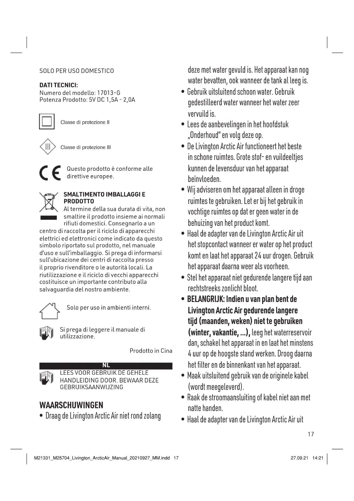 - Haal de adapter van de Livington Arctic Air uit M21331_M25704_Livington_ArcticAir_Manual_20210927_MM.indd 17M21331_M25704_Livington_ArcticAir_Manual_20210927_MM.indd 17 27.09.21 14:2127.09.21 14:2118 het stopcontact voor het reinigen, verwijderen/ vervangen van de filters of het ronddragen van het apparaat.