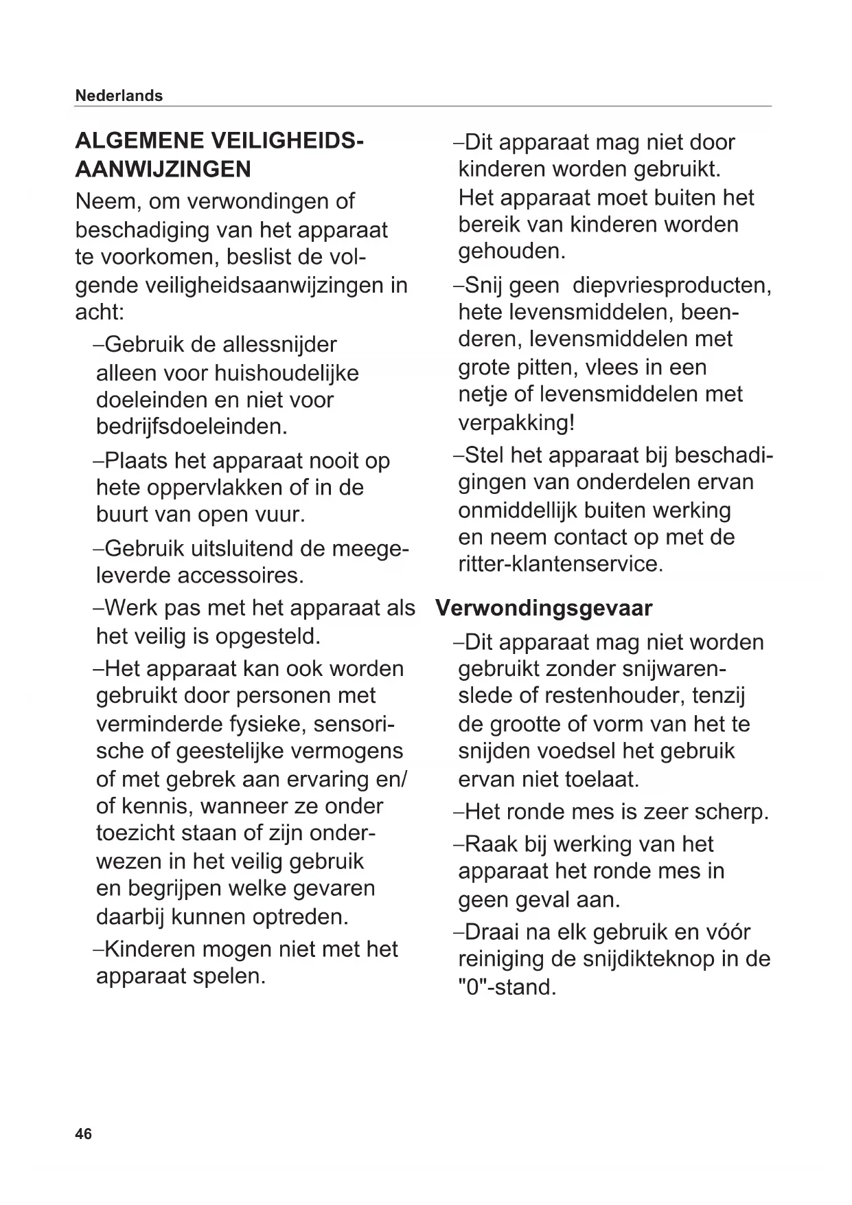 Simbolo Spiegazione Marcatura CE: il prodotto è conforme ai requisiti applicabili dell'Unione Europea. Il prodotto è stato immesso sul mercato successiva- mente al 13 agosto 2005. Non deve essere smaltito con i normali riuti domestici. Il simbolo che rappresenta un cassonetto barrato indica la necessità di raccolta dierenziata. Idoneo al contatto con alimenti.46 ALGEMENE VEILIGHEIDS- AANWIJZINGEN Neem, om verwondingen of beschadiging van het apparaat te voorkomen, beslist de vol- gende veiligheidsaanwijzingen in acht: – Gebruik de allessnijder alleen voor huishoudelijke doeleinden en niet voor bedrijfsdoeleinden. – Plaats het apparaat nooit op hete oppervlakken of in de buurt van open vuur. – Gebruik uitsluitend de meege- leverde accessoires. – Werk pas met het apparaat als het veilig is opgesteld. – Het apparaat kan ook worden gebruikt door personen met verminderde fysieke, sensori- sche of geestelijke vermogens of met gebrek aan ervaring en/ of kennis, wanneer ze onder toezicht staan of zijn onder- wezen in het veilig gebruik en begrijpen welke gevaren daarbij kunnen optreden. – Kinderen mogen niet met het apparaat spelen. – Dit apparaat mag niet door kinderen worden gebruikt. Het apparaat moet buiten het bereik van kinderen worden gehouden. – Snij geen diepvriesproducten, hete levensmiddelen, been- deren, levensmiddelen met grote pitten, vlees in een netje of levensmiddelen met verpakking! – Stel het apparaat bij beschadi- gingen van onderdelen ervan onmiddellijk buiten werking en neem contact op met de ritter-klantenservice. Verwondingsgevaar – Dit apparaat mag niet worden gebruikt zonder snijwaren- slede of restenhouder, tenzij de grootte of vorm van het te snijden voedsel het gebruik ervan niet toelaat. – Het ronde mes is zeer scherp. – Raak bij werking van het apparaat het ronde mes in geen geval aan. – Draai na elk gebruik en vóór reiniging de snijdikteknop in de "0"-stand. Nederlands47 Vouw de tekeningen aan de binnenzijde van de voor- en achterkaft van de gebruiksaanwij- zing open. Lees de bedieningshandleiding vóór ingebruikneming van het apparaat zorgvuldig door. Bewaar de bedieningshandleiding en geef deze mee als het apparaat van eigenaar verandert. Daarnaast is de actuele bedie- ningshandleiding ook beschik- baar onder www.ritterwerk.de. BEOOGD GEBRUIK De handmatige allessnijder is bedoeld voor het snijden van levensmiddelen voor huishoude- lijk gebruik. De allessnijder is geschikt voor contact met levensmiddelen. Niet-beoogd gebruik of onjuiste bediening kan leiden tot ernstige verwondingen of beschadiging van het apparaat. Hierbij verval- len alle rechten op garantie en aansprakelijkheid. INGEBRUIKNEMING Voorbereiding Haal het apparaat voorzichtig uit de verpakking. Verwijder alle ver- pakkingsonderdelen en bewaar deze samen met de verpakking. Maak het apparaat schoon voor- dat het in aanraking komt met levensmiddelen (zie REINIGEN). Apparaat plaatsen