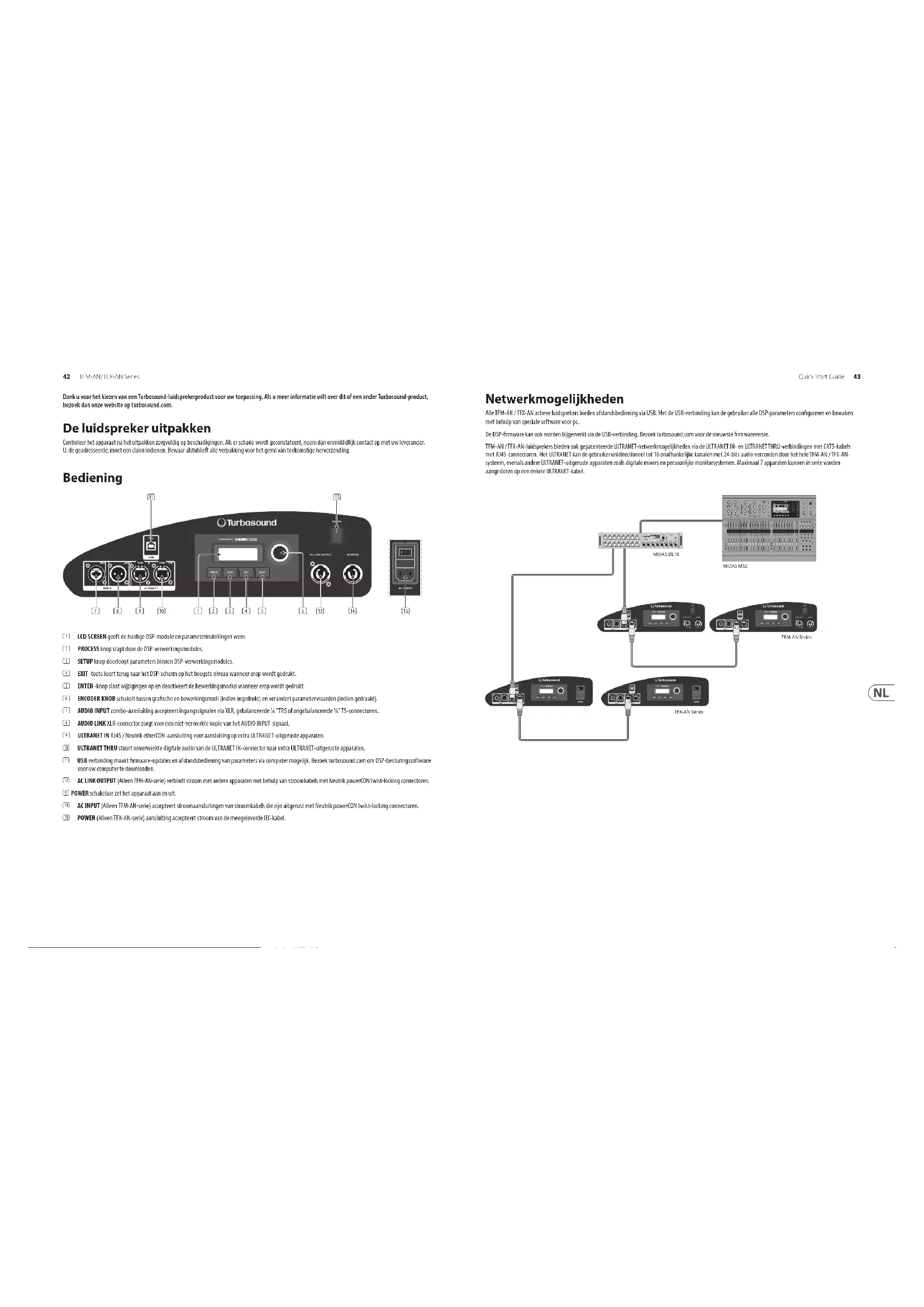 Nessuna Imposta la risposta in frequenza all'impostazione predenita.. Vocale Imposta la risposta in frequenza per fornire un altoparlante monitor ideale per la voce. Discorso Imposta la risposta in frequenza per un'intelligibilità ottimale del parlato. Riproduzione Imposta la risposta in frequenza ideale per la riproduzione musicale.. Utente Consente di denire la propria impostazione di risposta in frequenza accedendo al sottomenu corrispondente. XOVER Nessuna L'unità è impostata per la riproduzione a gamma completa / subwoofer predenita. HP 120 Hz Preset con ltro 120 Hz, 24 dB / ottava per il crossover tra subwoofer e altoparlanti full-range. HP 100 Hz Preset con 100 Hz, ltro 24 dB / ottava per crossover tra subwoofer e altoparlanti full-range.. Utente Sottomenu crossover utente per la combinazione con altri sistemi di altoparlanti full-range o subwoofer. Sottomenu Freq Seleziona la frequenza di crossover desiderata: Sistemi fullrange: da 75 Hz a 400 Hz. Fase Regola la fase assoluta (0 ° o 180 °). FBQ Auto Imposta automaticamente tutti i ltri necessari. Ogni volta che viene scoperta una nuova frequenza di feedback, il primo ltro verrà rilasciato per attenuare la nuova frequenza e così via. Single Attiva la funzionalità FBQ (rilevamento feedback), no a 8 ltri di feedback. Imparare Procedura automatica che ricerca le frequenze di feedback e blocca le impostazioni dopo che tutti gli 8 ltri sono stati impostati. AVVERTIMENTO! Utilizzare una protezione per l'udito durante questa procedura. Il segnale di feedback potrebbe avvicinarsi al livello massimo del sistema, il che potrebbe causare danni all'udito! Ripristina Reimposta tutti i ltri.. IMPOSTARE (Pagina 1) INGRESSO Ingresso Consente di scegliere la sorgente di ingresso audio. Scegli tra Locale (ingresso analogico) o ULTRANET (ad esempio, sistema di monitoraggio P16 o audio M32 tramite ULTRANET). Volume Regola il guadagno in ingresso. Con ingressi digitali ULTRANET su una gamma da +10 dB a -30 dB. Con ingresso analogico da 0 dB a -∞ dB. POSIZIONE In piedi Per posizionare l'altoparlante su un supporto per montaggio su palo (gamma completa) o sul pavimento (subwoofer). Pavimento Per posizionare l'altoparlante sul pavimento come altoparlante monitor (cuneo). Angolo Per posizionare l'altoparlante in un angolo vicino al sotto (installazione ssa); Per posizionare l'altoparlante in un angolo (subwoofer). RITARDO Ritardo Regola la quantità di ritardo (max 300 msec = 103,08 mo 338,19 piedi). Unità Selettore tra msec, metro e piedi. LIMITATORE Limit Regola la soglia del limitatore per il segnale di ingresso (da OFF a -30 dB). Questa regolazione della soglia consente di impostare una potenza di uscita massima che è inferiore alla potenza massima nominale del sistema di altoparlanti.42 TFM-AN/TFX-AN Series Quick Start Guide 43 Dank u voor het kiezen van een Turbosound-luidsprekerproduct voor uw toepassing. Als u meer informatie wilt over dit of een ander Turbosound-product, bezoek dan onze website op turbosound.com. De luidspreker uitpakken Controleer het apparaat na het uitpakken zorgvuldig op beschadigingen. Als er schade wordt geconstateerd, neem dan onmiddellijk contact op met uw leverancier. U, de geadresseerde, moet een claim indienen. Bewaar alstublieft alle verpakking voor het geval van toekomstige herverzending. Bediening (1) LCD SCREEN geeft de huidige DSP-module en parameterinstellingen weer. (2) PROCESS knop stapt door de DSP-verwerkingsmodules. (3) SETUP knop doorloopt parameters binnen DSP-verwerkingsmodules. (4) EXIT -toets keert terug naar het DSP-scherm op het hoogste niveau wanneer erop wordt gedrukt. (5) ENTER -knop slaat wijzigingen op en deactiveert de bewerkingsmodus wanneer erop wordt gedrukt. (6) ENCODER KNOB schakelt tussen grasche en bewerkingsmodi (indien ingedrukt) en verandert parameterwaarden (indien gedraaid). (7) AUDIO INPUT combo-aansluiting accepteert ingangssignalen via XLR, gebalanceerde ¼ "TRS of ongebalanceerde ¼" TS-connectoren.. (8) AUDIO LINK XLR-connector zorgt voor een niet-verwerkte kopie van het AUDIO INPUT-signaal. (9) ULTRANET IN RJ45 / Neutrik etherCON-aansluiting voor aansluiting op extra ULTRANET-uitgeruste apparaten. (10) ULTRANET THRU stuurt onverwerkte digitale audio van de ULTRANET IN-connector naar extra ULTRANET-uitgeruste apparaten. (11) USB verbinding maakt rmware-updates en afstandsbediening van parameters via computer mogelijk. Bezoek turbosound.com om DSP-besturingssoftware voor uw computer te downloaden. (12) AC LINK OUTPUT (Alleen TFM-AN-serie) verbindt stroom met andere apparaten met behulp van stroomkabels met Neutrik powerCON twist-locking connectoren. (13) POWER schakelaar zet het apparaat aan en uit. (14) AC INPUT (Alleen TFM-AN-serie) accepteert stroomaansluitingen van stroomkabels die zijn uitgerust met Neutrik powerCON twist-locking connectoren. (15) POWER (Alleen TFX-AN-serie) aansluiting accepteert stroom van de meegeleverde IEC-kabel. (1) (2) (3) (4) (5) (6)(7) (8) (9) (12) (14) (10) (13)(11) (15) Netwerkmogelijkheden Alle TFM-AN / TFX-AN actieve luidsprekers bieden afstandsbediening via USB. Met de USB-verbinding kan de gebruiker alle DSP-parameters congureren en bewaken met behulp van speciale software voor pc. De DSP-rmware kan ook worden bijgewerkt via de USB-verbinding. Bezoek turbosound.com voor de nieuwste rmwareversie. TFM-AN / TFX-AN-luidsprekers bieden ook gepatenteerde ULTRANET-netwerkmogelijkheden via de ULTRANET IN- en ULTRANET THRU-verbindingen met CAT5-kabels met RJ45-connectoren. Met ULTRANET kan de gebruiker unidirectioneel tot 16 onafhankelijke kanalen met 24-bits audio verzenden door het hele TFM-AN / TFX-AN- systeem, evenals andere ULTRANET-uitgeruste apparaten zoals digitale mixers en persoonlijke monitorsystemen. Maximaal 7 apparaten kunnen in serie worden aangesloten op een enkele ULTRANET-kabel. MIDAS M32 MIDAS DL16 TFM-AN Series TFX-AN Series44 TFM-AN/TFX-AN Series Quick Start Guide 45 Netstroom in netwerk TFM-AN-luidsprekers vergemakkeli