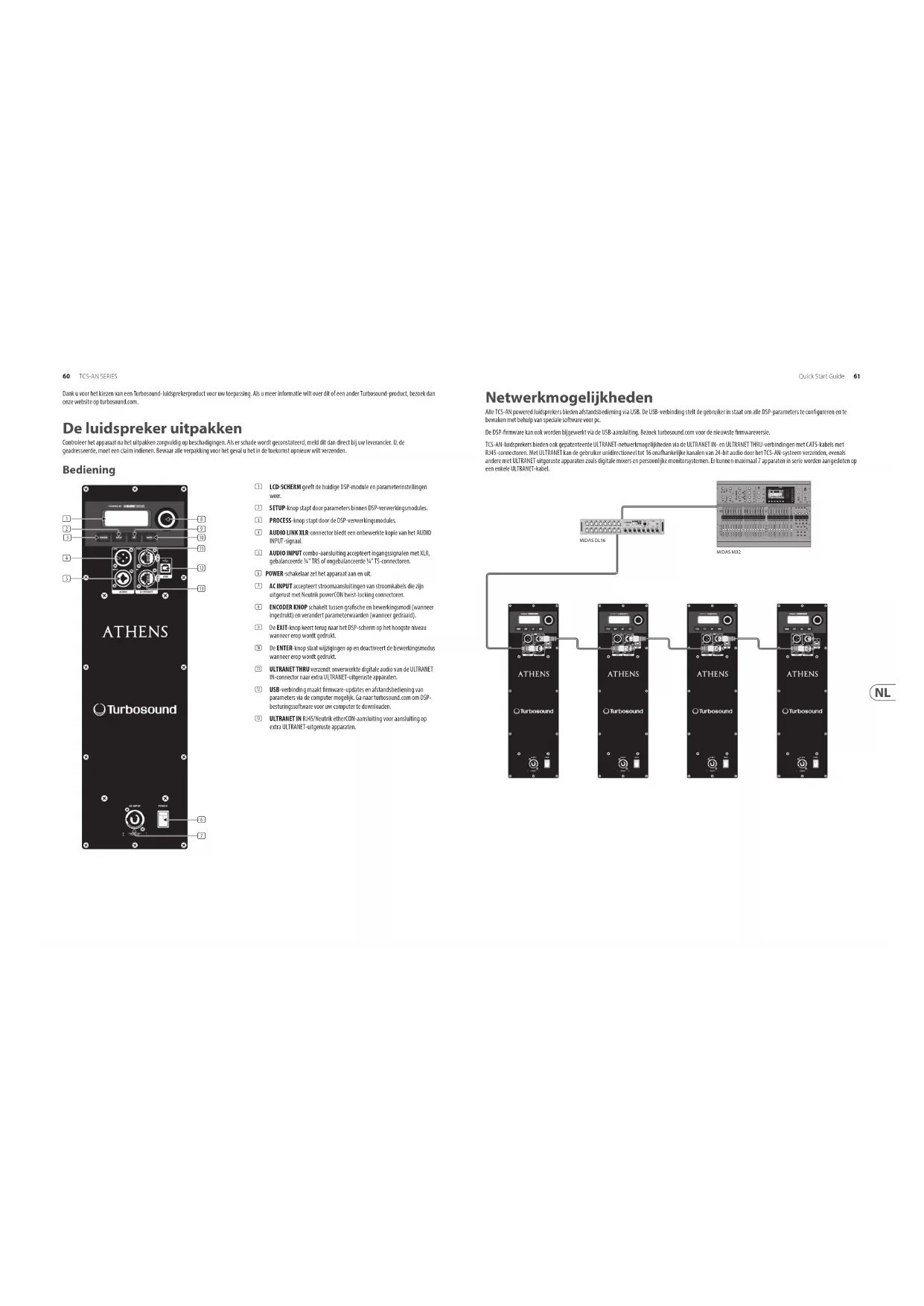 BEFORE AFTER Fig. 1 Fig. 4 Fig. 5 Fig. 6 Fig. 2 Fig. 360 TCS-AN SERIES Quick Start Guide 61 Dank u voor het kiezen van een Turbosound-luidsprekerproduct voor uw toepassing. Als u meer informatie wilt over dit of een ander Turbosound-product, bezoek dan onze website op turbosound.com. De luidspreker uitpakken Controleer het apparaat na het uitpakken zorgvuldig op beschadigingen. Als er schade wordt geconstateerd, meld dit dan direct bij uw leverancier. U, de geadresseerde, moet een claim indienen. Bewaar alle verpakking voor het geval u het in de toekomst opnieuw wilt verzenden. Bediening (1) LCD-SCHERM geeft de huidige DSP-module en parameterinstellingen weer. (2) SETUP-knop stapt door parameters binnen DSP-verwerkingsmodules. (3) PROCESS-knop stapt door de DSP-verwerkingsmodules. (4) AUDIO LINK XLR-connector biedt een onbewerkte kopie van het AUDIO INPUT-signaal. (5) AUDIO INPUT combo-aansluiting accepteert ingangssignalen met XLR, gebalanceerde ¼" TRS of ongebalanceerde ¼" TS-connectoren. (6) POWER-schakelaar zet het apparaat aan en uit. (7) AC INPUT accepteert stroomaansluitingen van stroomkabels die zijn uitgerust met Neutrik powerCON twist-locking connectoren. (8) ENCODER KNOP schakelt tussen grasche en bewerkingsmodi (wanneer ingedrukt) en verandert parameterwaarden (wanneer gedraaid). (9) De EXIT-knop keert terug naar het DSP-scherm op het hoogste niveau wanneer erop wordt gedrukt. (10) De ENTER-knop slaat wijzigingen op en deactiveert de bewerkingsmodus wanneer erop wordt gedrukt. (11) ULTRANET THRU verzendt onverwerkte digitale audio van de ULTRANET IN-connector naar extra ULTRANET-uitgeruste apparaten. (12) USB-verbinding maakt rmware-updates en afstandsbediening van parameters via de computer mogelijk. Ga naar turbosound.com om DSP- besturingssoftware voor uw computer te downloaden. (13) ULTRANET IN RJ45/Neutrik etherCON-aansluiting voor aansluiting op extra ULTRANET-uitgeruste apparaten. (6) (7) (9) (10) (11) (13) (8) (1) (2) (3) (4) (5) (12) Netwerkmogelijkheden Alle TCS-AN powered luidsprekers bieden afstandsbediening via USB. De USB-verbinding stelt de gebruiker in staat om alle DSP-parameters te congureren en te bewaken met behulp van speciale software voor pc. De DSP-rmware kan ook worden bijgewerkt via de USB-aansluiting. Bezoek turbosound.com voor de nieuwste rmwareversie. TCS-AN-luidsprekers bieden ook gepatenteerde ULTRANET-netwerkmogelijkheden via de ULTRANET IN- en ULTRANET THRU-verbindingen met CAT5-kabels met RJ45-connectoren. Met ULTRANET kan de gebruiker unidirectioneel tot 16 onafhankelijke kanalen van 24-bit audio door het TCS-AN-systeem verzenden, evenals andere met ULTRANET uitgeruste apparaten zoals digitale mixers en persoonlijke monitorsystemen. Er kunnen maximaal 7 apparaten in serie worden aangesloten op een enkele ULTRANET-kabel. MIDAS M32MIDAS DL1662 TCS-AN SERIES Quick Start Guide 63 TCS-AN DSP-menustructuur Volledig bereik Subwoofer Functie VERWERKEN EQ Geen Geen Stelt de frequentierespons in op de standaardinstelling. Matrix2 – Stelt een gecorrigeerde frequentierespons in voor 2 samen opgestelde kasten. Matrix3 – Stelt een gecorrigeerde frequentierespons in voor 3 of meer kasten die samen zijn gerangschikt. Gebruiker Gebruiker Hiermee kunt u uw eigen frequentierespons instellen door het bijbehorende submenu te openen. Submenu Lage/hoge rekken Lage/hoge rekken Hiermee kunt u een lter voor lage en hoge rekken deniëren. Parametrisch 1 & 2 Parametrisch 1 & 2 Hiermee kunt u een parametrische bel-type EQ deniëren (Frequency, Qual. en Gain). XOVER Geen – Eenheid is standaard ingesteld voor reproductie over het volledige bereik. HP 100 Hz LP 100 Hz Vooraf ingesteld met 100 Hz, 24 dB/octaalter voor crossover tussen subwoofer en full-range luidsprekers. HP 120 Hz LP 120 Hz Vooraf ingesteld met 120 Hz, 24 dB/octaalter voor crossover tussen subwoofer en full-range luidsprekers. Gebruiker Gebruiker Gebruiker crossover-submenu voor combinatie met andere full-range of subwoofer-luidsprekersystemen Submenu frequentie frequentie Selecteer de gewenste crossover-frequentie: