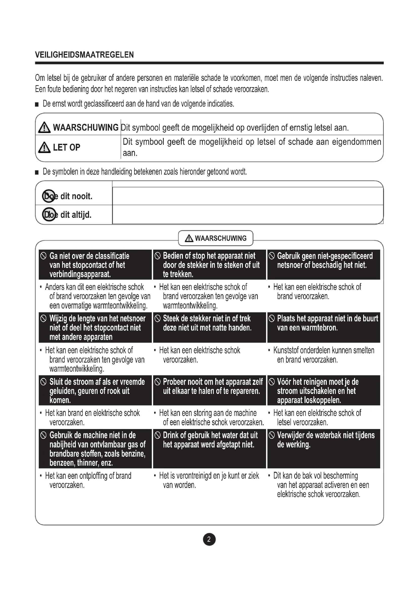 Om letsel bij de gebruiker of andere personen en materiële schade te voorkomen, moet men de volgende instructies naleven. Een foute bediening door het negeren van instructies kan letsel of schade veroorzaken. ■ De ernst wordt geclassiceerd aan de hand van de volgende indicaties. WAARSCHUWING Dit symbool geeft de mogelijkheid op overlijden of ernstig letsel aan. LET OP Dit symbool geeft de mogelijkheid op letsel of schade aan eigendommen aan. ■ De symbolen in deze handleiding betekenen zoals hieronder getoond wordt. Doe dit nooit. Doe dit altijd.