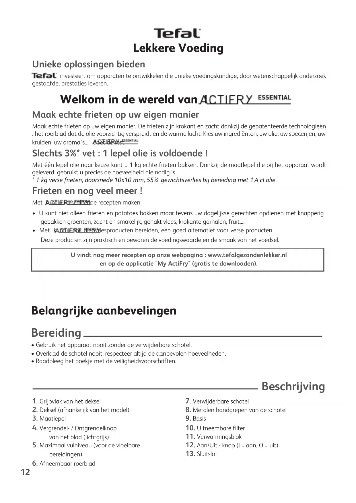 - Raadpleeg het boekje met de veiligheidsvoorschriften. TEFAL903B-ACTIFRY_Essential_1505087843_Mise en page 1 20/12/12 18:54 Page1213