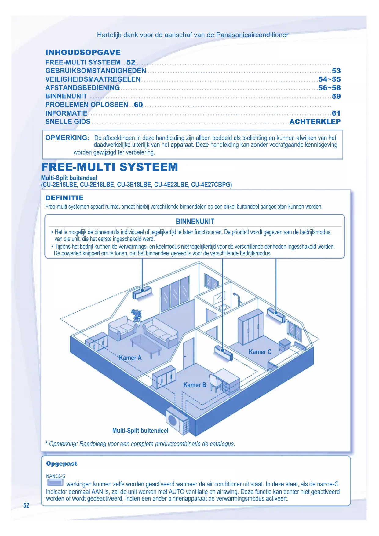 SNELLE GIDS ACHTERKLEP OPMERKING: De afbeeldingen in deze handleiding zijn alleen bedoeld als toelichting en kunnen afwijken van het daadwerkelijke uiterlijk van het apparaat. Deze handleiding kan zonder voorafgaande kennisgeving worden gewijzigd ter verbetering. FREE-MULTI SYSTEEM Opgepast NANOE