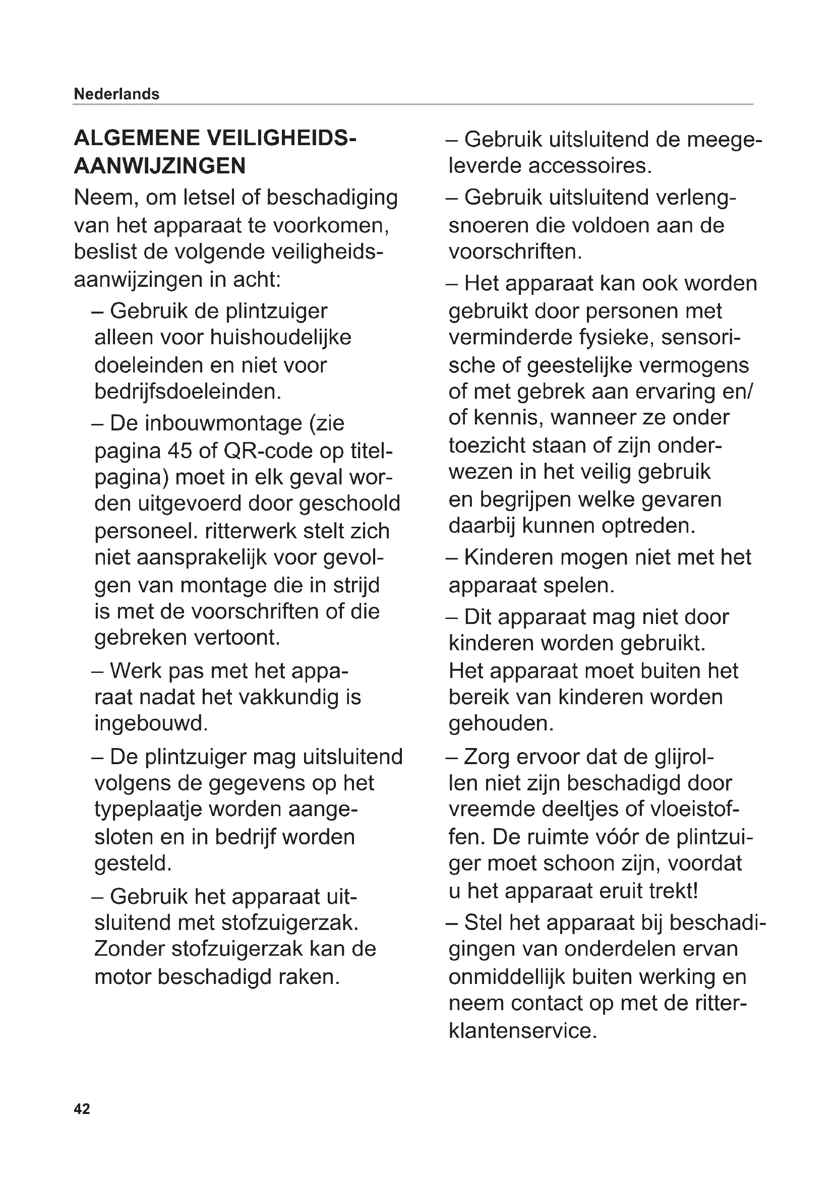 - Reinig de plintzuiger uitsluitend met een droge of licht bevoch- tigde doek. ONDERHOUD De plintzuiger is onderhoudsvrij. AFVALVERWIJDERING Dit product mag aan het einde van zijn gebruiks- duur niet met het gewone huisvuil worden meegegeven. Het moet worden afgegeven bij een verzamelpunt voor recycling van elektrische en elektronische apparaten. Met het symbool op het product, de gebruiksaanwijzing of de verpakking wordt daarop gewezen. De materialen zijn recyclebaar volgens de aanduiding. Met het hergebruik, de materiaalrecycling of andere vormen van verwerking van afgedankte apparaten levert u een belangrijke bijdrage aan de bescherming van ons milieu. Informeer bij uw gemeente naar de bevoegde instantie voor afvalverwerking. REACH-VERORDENING Zie www.ritterwerk.de SPECIALE ACCESSOIRES De accessoires bestaan uit een inschuifmondstuk, een exibele 3 m lange slang, spleetmondstuk en een borstelopzetstuk.