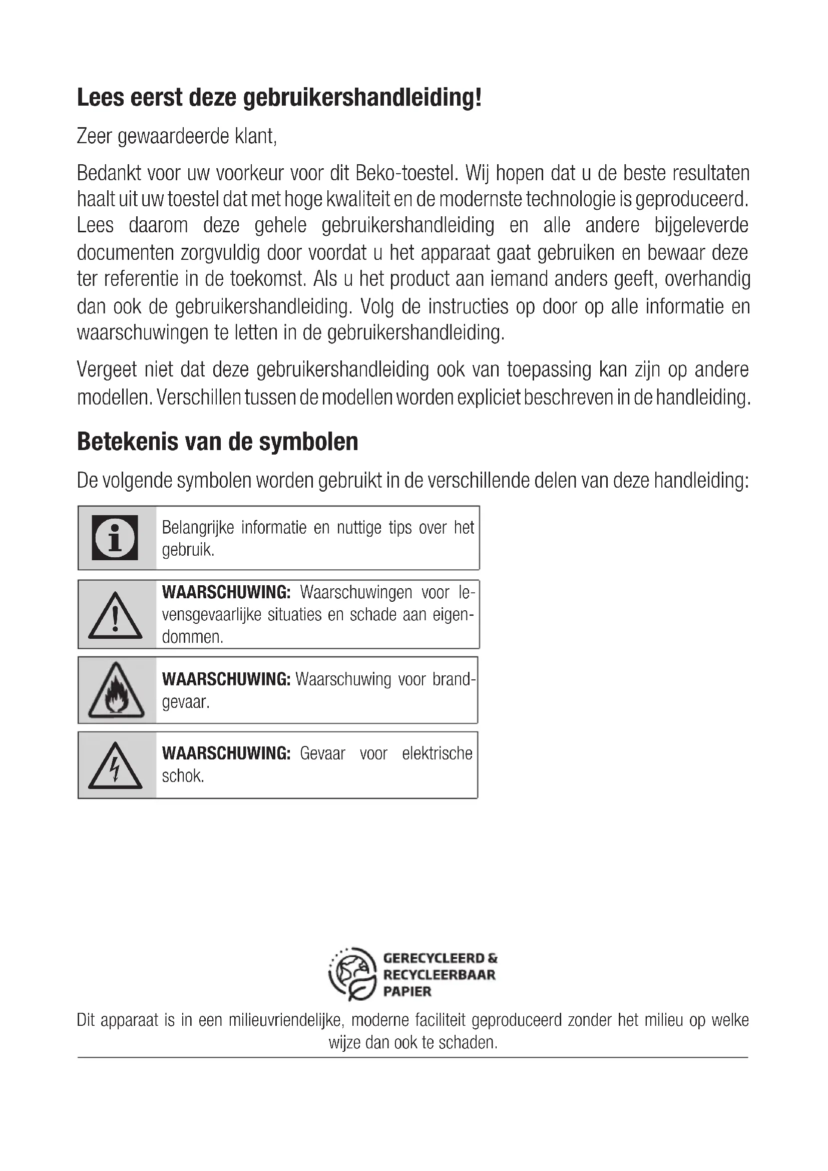 შეამოწმეთ ნახშირის ფილტრი. ჩვეულებრივ პირობებში მოწყობილობის ნახშირის ფილტრები უნდა შეცვალოთ 3 თვეში ერთხელ.Lees eerst deze gebruikershandleiding! Zeer gewaardeerde klant, Bedankt voor uw voorkeur voor dit Beko-toestel. Wij hopen dat u de beste resultaten haalt uit uw toestel dat met hoge kwaliteit en de modernste technologie is geproduceerd. Lees daarom deze gehele gebruikershandleiding en alle andere bijgeleverde documenten zorgvuldig door voordat u het apparaat gaat gebruiken en bewaar deze ter referentie in de toekomst. Als u het product aan iemand anders geeft, overhandig dan ook de gebruikershandleiding. Volg de instructies op door op alle informatie en waarschuwingen te letten in de gebruikershandleiding. Vergeet niet dat deze gebruikershandleiding ook van toepassing kan zijn op andere modellen. Verschillen tussen de modellen worden expliciet beschreven in de handleiding. Betekenis van de symbolen De volgende symbolen worden gebruikt in de verschillende delen van deze handleiding: