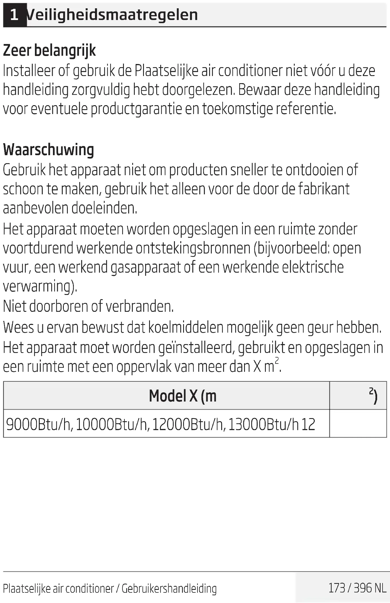 - 9 Onderhoud 219 10 Problemen oplossen 220 11 Europese richtlijnen voor afvalverwijdering 221 12 Installatie-instructies 222 12.1 F-Gas instructie 13 Specificaties 223Plaatselijke air conditioner / Gebruikershandleiding 173 / 396 NL 1 Veiligheidsmaatregelen Zeer belangrijk Installeer of gebruik de Plaatselijke air conditioner niet vóór u deze handleiding zorgvuldig hebt doorgelezen. Bewaar deze handleiding voor eventuele productgarantie en toekomstige referentie. Waarschuwing Gebruik het apparaat niet om producten sneller te ontdooien of schoon te maken, gebruik het alleen voor de door de fabrikant aanbevolen doeleinden. Het apparaat moeten worden opgeslagen in een ruimte zonder voortdurend werkende ontstekingsbronnen (bijvoorbeeld: open vuur, een werkend gasapparaat of een werkende elektrische verwarming). Niet doorboren of verbranden. Wees u ervan bewust dat koelmiddelen mogelijk geen geur hebben. Het apparaat moet worden geïnstalleerd, gebruikt en opgeslagen in een ruimte met een oppervlak van meer dan X m p. 222