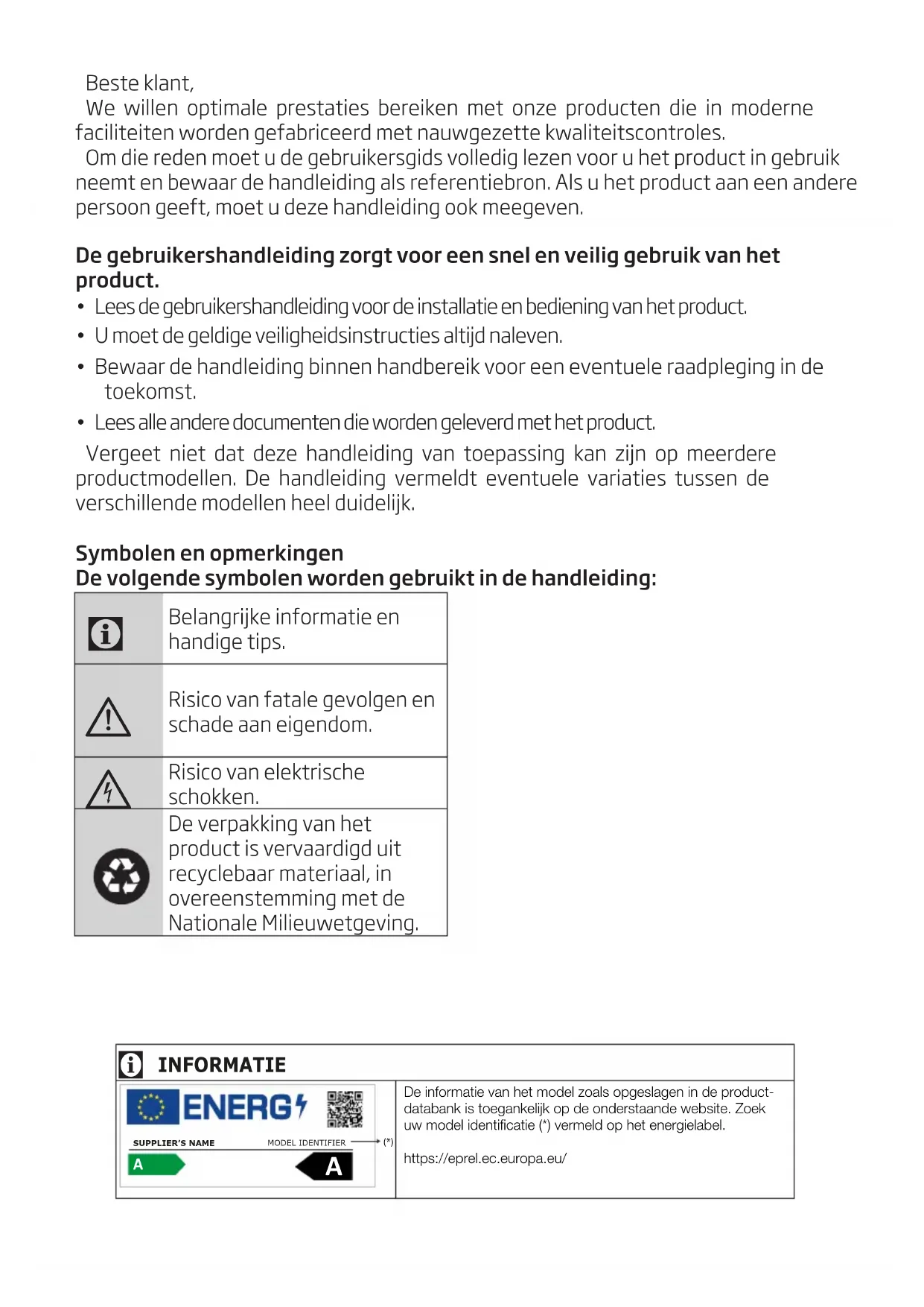 - Bewaar de handleiding binnen handbereik voor een eventuele raadpleging in de toekomst.