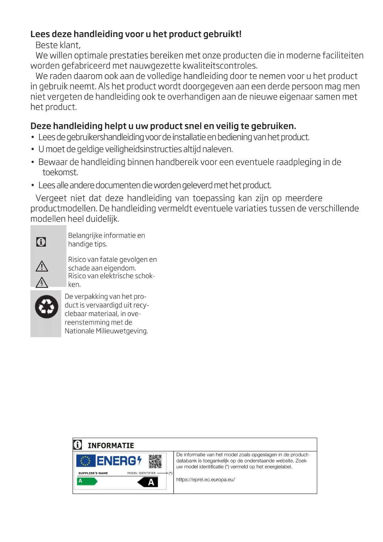 Belangrijke informatie en handige tips. Risico van fatale gevolgen en schade aan eigendom. Risico van elektrische schok-ken. De verpakking van het pro-duct is vervaardigd uit recy-clebaar materiaal, in ove-reenstemming met de Nationale Milieuwetgeving. INFORMATIE