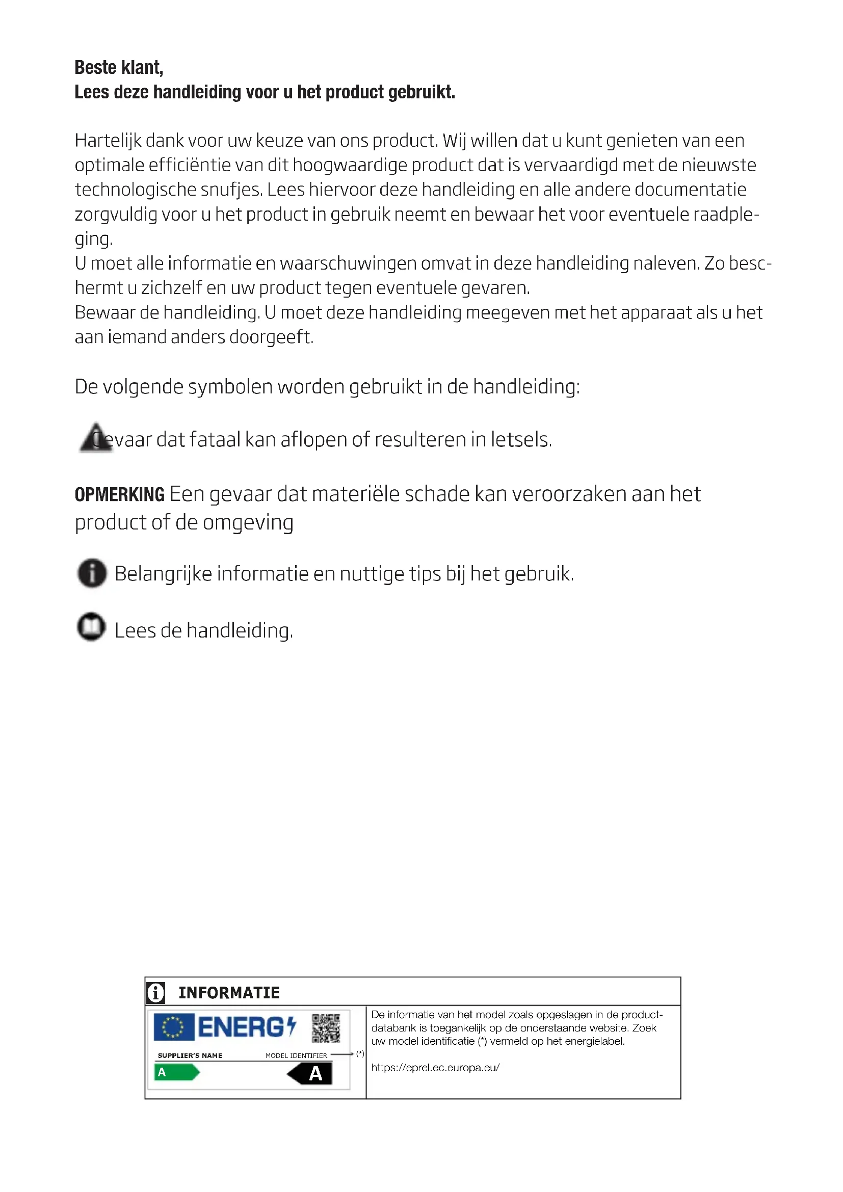 WAARSCHUWING: Als het probleem aanhoudt nadat u de instructies in deze sectie hebt gevolgd, kunt u contact opnemen met uw verkoper of een Geautoriseerde Dienst. Probeer het product niet te repareren.DISCLAIMER / WAARSCHUWING Sommige (eenvoudige) defecten kunnen correct worden behandeld door de eindgebruiker zonder dat dit aanleiding geeft tot veiligheidsproblemen of een onveilig gebruik, op voorwaarde dat ze worden uitgevoerd binnen de limieten en in overeenstemming met de volgende instructies (zie het hoofdstuk “Zelf-reparatie”). Om die reden, tenzij anderzijds toegelaten in het onderstaande hoofdstuk ‘Zelf-reparatie”, moeten reparaties worden uitgevoerd door geregistreerde professionele monteurs om veiligheidsproblemen te voorkomen. Een geregistreerde professionele monteur is een professionele monteur die toegang heeft gekregen tot de instructies en de lijst met reserveonderdelen van dit product door de fabrikant, in overeenstemming met de methoden beschreven in wetsbesluiten in overeenstemming met Richtlijn 2009/125/EC. Hoewel, de onderhouds- en reparatiewerken in het kader van de garantievoorwaarden mogen uitsluitend worden uitgevoerd door de gespecialiseerd vertegenwoordiger (m.a.w. geautoriseerde professionele monteurs) die u kunt bereiken via het telefoonnummer vermeld in de gebruikshandleiding/garantiekaart of via uw geautoriseerde verdeler. Om die reden zullen reparaties die worden uitgevoerd door professionele monteurs (die niet zijn geautoriseerd door Beko) de garantie nietig verklaren. Zelf-reparatie De eindgebruiker kan de volgende reserveonderdelen zelf repareren: deur handgrepen, deur scharnieren, laden, manden en deurpakkingen (een bijgewerkte lijst is ook beschikbaar op support.beko.com op 1 maart 2021). Bovendien, om de veiligheid van het product te garanderen en het risico van ernstig letsel te voorkomen, moet de vermelde zelf-reparatie worden uitgevoerd in overeenstemming met de instructies in de handleiding voor zelf-reparatie of die beschikbaar is in in support.beko.com Uit veiligheidsoverwegingen moet u de stekker van het product loskoppelen voor u een zelf-reparatie probeert uit te voeren. Reparaties en pogingen tot reparatie door eindgebruikers van onderdelen die niet zijn omvat in deze lijst en/of waarbij de instructies in de handleiding voor zelf-reparatie of die beschikbaar zijn in support.beko.com niet worden nageleefd, kunnen resulteren in veiligheidsproblemen die niet kunnen worden toegewezen aan Beko Beko en deze zullen de garantie van het product nietig verklaren. Om die reden raden wij ten stelligste af dat eindgebruikers op eigen houtje reparaties proberen uit te voeren die buiten de vermelde lijst van reserveonderdelen vallen en in dergelijke situaties beroep doen op een geautoriseerde professionele monteur of geregistreerde professionele monteurs. Dergelijke pogingen van eindgebruikers kunnen daarentegen veiligheidsproblemen en schade aan het product veroorzaken en resulteren in brand, overstromingen, elektrische schokken en ernstig persoonlijk letsel. Als voorbeeld, maar niet beperkt tot, de volgende reparaties moeten worden uitgevoerd door geautoriseerde professionele servicemonteurs of geregistreerde professionele monteurs: compressor, koelcircuit, moederbord,omzetter bord, weergavebord, etc. De fabrikant/verkoper kan niet aansprakelijk worden gesteld wanneer eindgebruikers de bovenstaande instructies niet naleven. De beschikbaarheid van de reserveonderdelen van de koelkast die u hebt gekocht is 10 jaar. Tijdens deze periode zijn de originele reserveonderdelen beschikbaar voor de correcte werking van uw koelkast.De minimale duur van de garantie van de koelkast die u hebt gekocht, is 24 maanden. Dit product is uitgerust met een lichtbron van de “G”-energieklasse. De lichtbron in dit product mag enkel worden vervangen door professionele reparateurs.• Αγαπητέ Πελάτη,