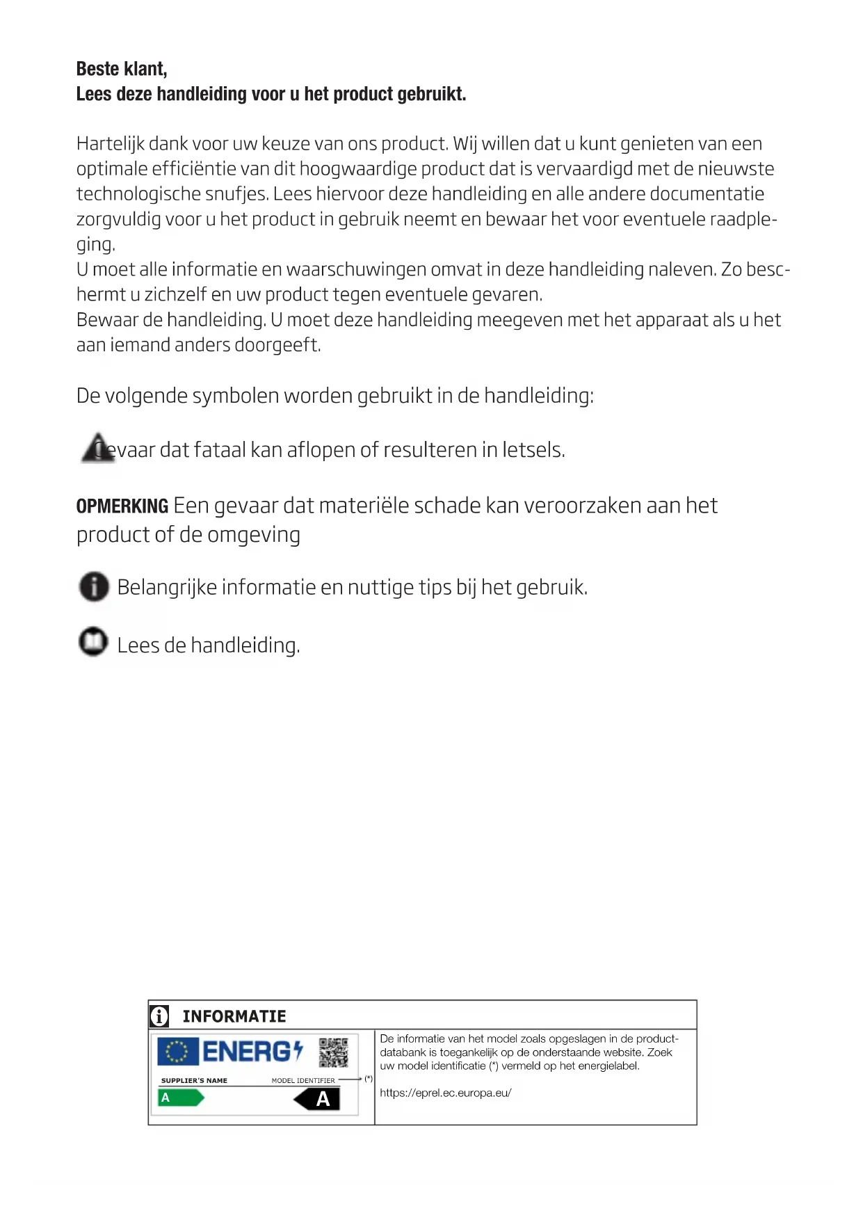 Beste klant, Lees deze handleiding voor u het product gebruikt. Hartelijk dank voor uw keuze van ons product. Wij willen dat u kunt genieten van een optimale efficiëntie van dit hoogwaardige product dat is vervaardigd met de nieuwste technologische snufjes. Lees hiervoor deze handleiding en alle andere documentatie zorgvuldig voor u het product in gebruik neemt en bewaar het voor eventuele raadple- ging. U moet alle informatie en waarschuwingen omvat in deze handleiding naleven. Zo besc- hermt u zichzelf en uw product tegen eventuele gevaren. Bewaar de handleiding. U moet deze handleiding meegeven met het apparaat als u het aan iemand anders doorgeeft. De volgende symbolen worden gebruikt in de handleiding: Gevaar dat fataal kan aflopen of resulteren in letsels. OPMERKING Een gevaar dat materiële schade kan veroorzaken aan het product of de omgeving Belangrijke informatie en nuttige tips bij het gebruik. Lees de handleiding.3/24 FL Koelkast / Handleiding 1 Veiligheidsinstructies 4