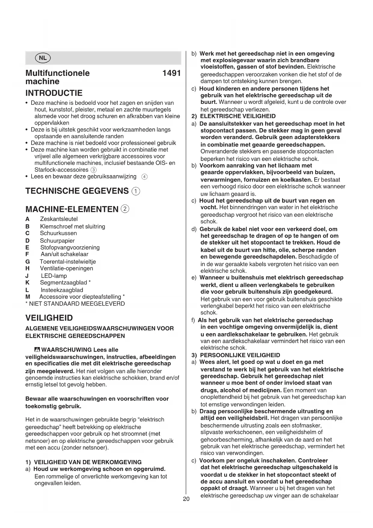 ELEKTRISCHE GEREEDSCHAPPEN - WAARSCHUWING Lees alle veiligheidswaarschuwingen, instructies, afbeeldingen en specicaties die met dit elektrische gereedschap zijn meegeleverd. Het niet volgen van alle hieronder genoemde instructies kan elektrische schokken, brand en/of ernstig letsel tot gevolg hebben. Bewaar alle waarschuwingen en voorschriften voor toekomstig gebruik. Het in de waarschuwingen gebruikte begrip “elektrisch gereedschap” heeft betrekking op elektrische gereedschappen voor gebruik op het stroomnet (met netsnoer) en op elektrische gereedschappen voor gebruik met een accu (zonder netsnoer).