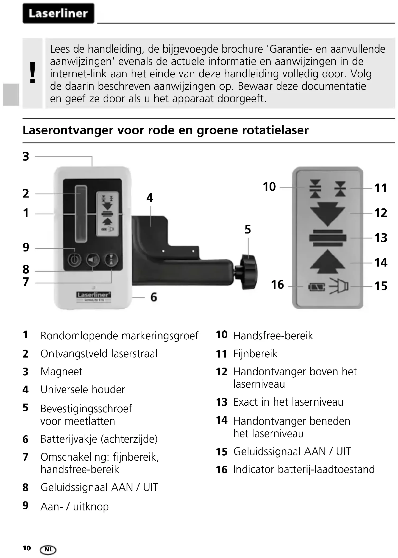Laserontvanger voor rode en groene rotatielaser Rondomlopende markeringsgroef Ontvangstveld laserstraal Magneet Universele houder Bevestigingsschroef voor meetlatten Batterijvakje (achterzijde) Omschakeling: fijnbereik, handsfree-bereik Geluidssignaal AAN / UIT Aan- / uitknop Handsfree-bereik Fijnbereik Handontvanger boven het laserniveau Exact in het laserniveau Handontvanger beneden het laserniveau Geluidssignaal AAN / UIT Indicator batterij-laadtoestand NLSensoLite 110 / SensoLite 110 G