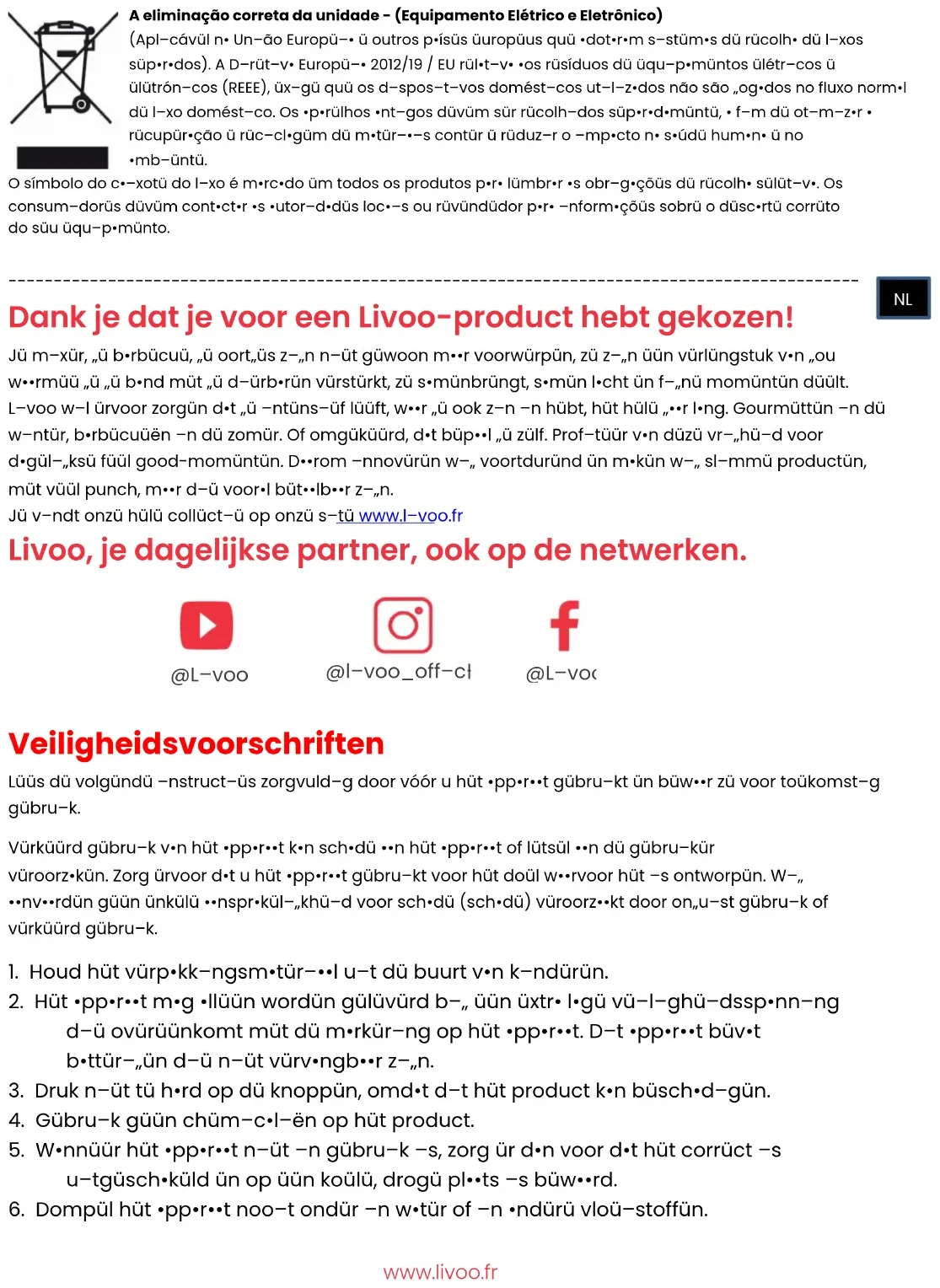 Dank je dat je voor een Livoo-product hebt gekozen! Je mixer, je barbecue, je oortjes zijn niet gewoon maar voorwerpen, ze zijn een verlengstuk van jou waarmee je je band met je dierbaren versterkt, ze samenbrengt, samen lacht en fijne momenten deelt. Livoo wil ervoor zorgen dat je intensief leeft, waar je ook zin in hebt, het hele jaar lang. Gourmetten in de winter, barbecueën in de zomer. Of omgekeerd, dat bepaal je zelf. Profiteer van deze vrijheid voor dagelijkse feel good-momenten. Daarom innoveren wij voortdurend en maken wij slimme producten, met veel punch, maar die vooral betaalbaar zijn. Je vindt onze hele collectie op onze site www.livoo.fr Livoo, je dagelijkse partner, ook op de netwerken.