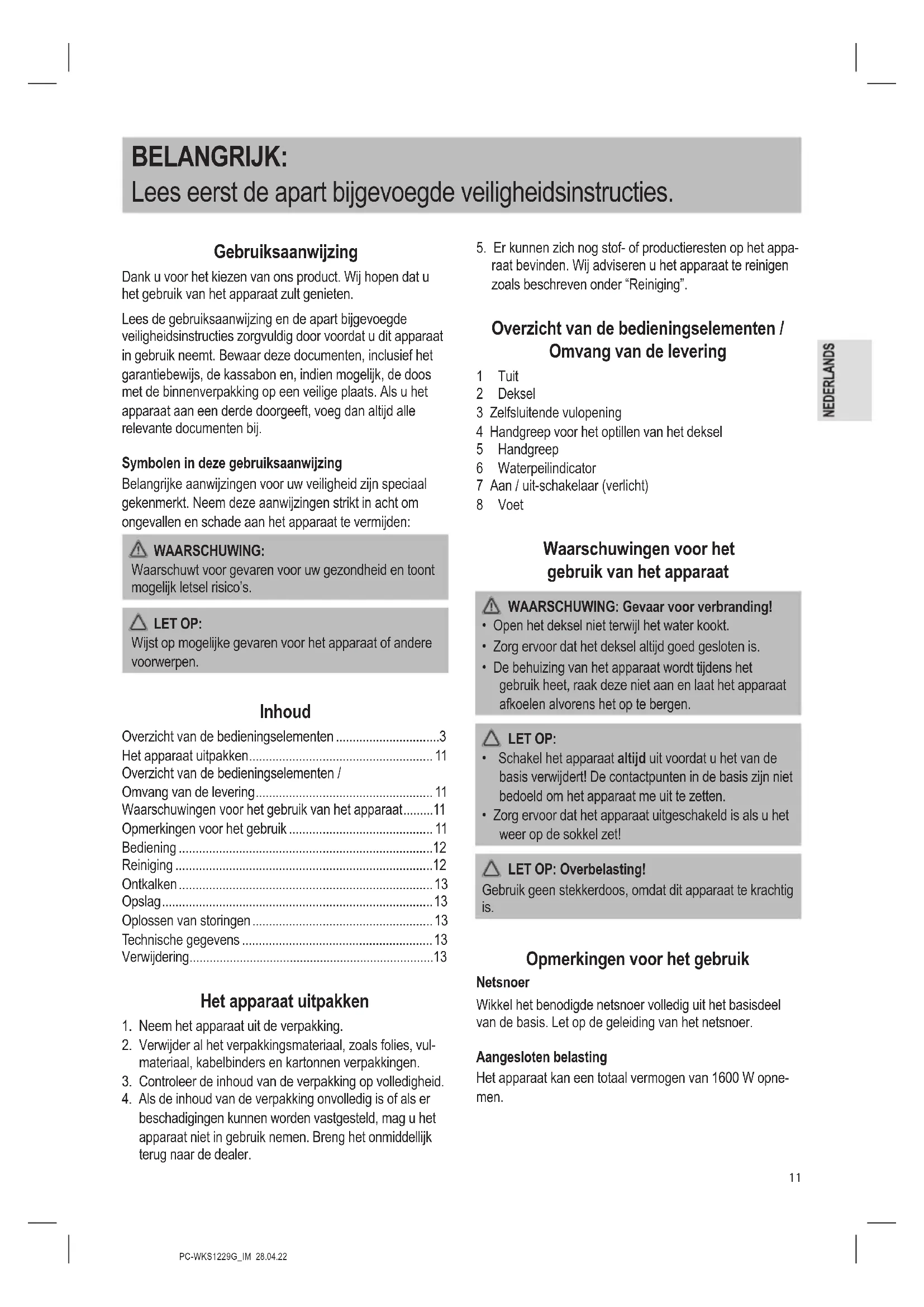 - Zorg ervoor dat het apparaat uitgeschakeld is als u het weer op de sokkel zet! LET OP: Overbelasting! Gebruik geen stekkerdoos, omdat dit apparaat te krachtig is. Opmerkingen voor het gebruik Netsnoer Wikkel het benodigde netsnoer volledig uit het basisdeel van de basis. Let op de geleiding van het netsnoer. Aangesloten belasting Het apparaat kan een totaal vermogen van 1600 W opne- men.PC-WKS1229G_IM 28.04.22