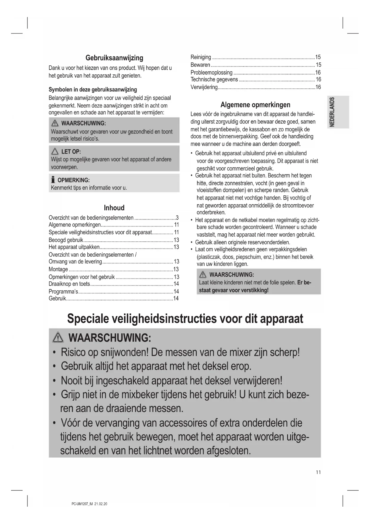 - Het apparaat niet langer dan 2 minuten inschakelen. Laat het ap- paraat 1 minuut afkoelen alvorens hem opnieuw te gebruiken.PC-UM1207_IM 21.02.20