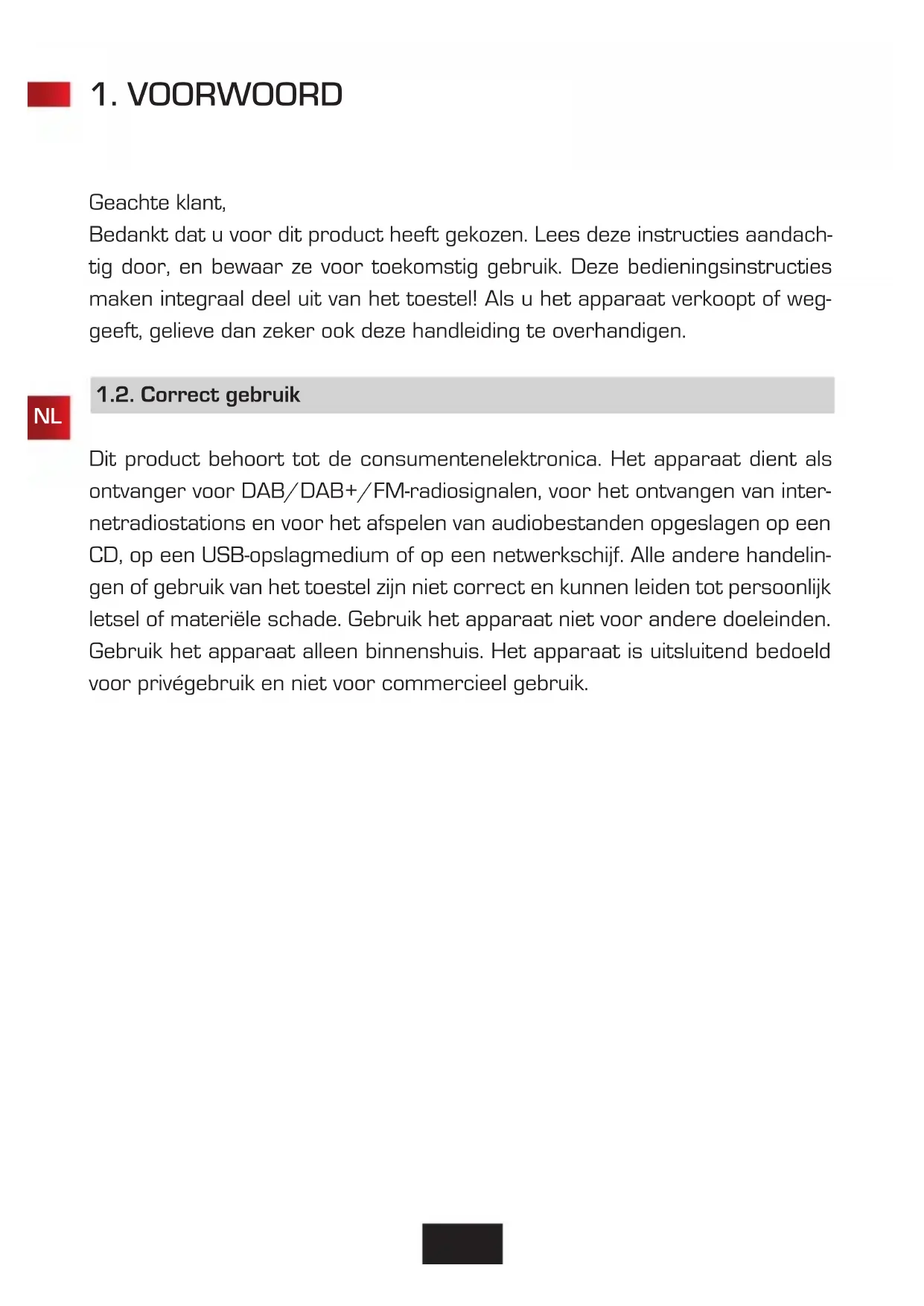 17NL 265264Handleiding Geachte klant, Bedankt dat u voor dit product heeft gekozen. Lees deze instructies aandach- tig door, en bewaar ze voor toekomstig gebruik. Deze bedieningsinstructies maken integraal deel uit van het toestel! Als u het apparaat verkoopt of weg- geeft, gelieve dan zeker ook deze handleiding te overhandigen. 1.2. Correct gebruik Dit product behoort tot de consumentenelektronica. Het apparaat dient als ontvanger voor DAB/DAB+/FM-radiosignalen, voor het ontvangen van inter- netradiostations en voor het afspelen van audiobestanden opgeslagen op een CD, op een USB-opslagmedium of op een netwerkschijf. Alle andere handelin- gen of gebruik van het toestel zijn niet correct en kunnen leiden tot persoonlijk letsel of materiële schade. Gebruik het apparaat niet voor andere doeleinden. Gebruik het apparaat alleen binnenshuis. Het apparaat is uitsluitend bedoeld voor privégebruik en niet voor commercieel gebruik.