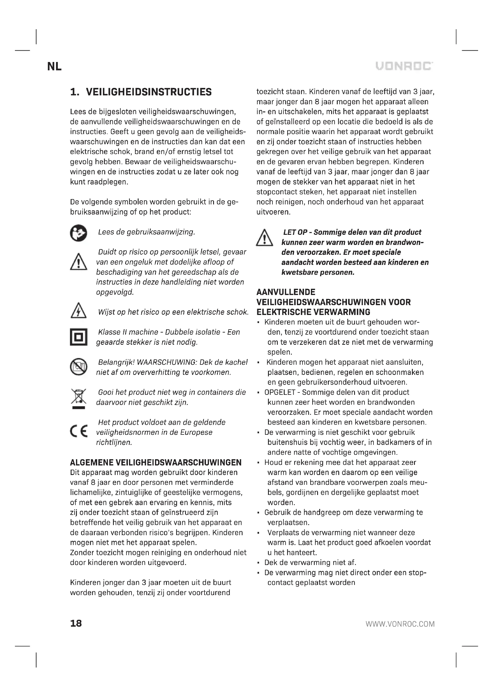 Lees de bijgesloten veiligheidswaarschuwingen, de aanvullende veiligheidswaarschuwingen en de instructies. Geeft ugeen gevolg aan de veiligheids- waarschuwingen en de instructies dan kan dat een elektrische schok, brand en/of ernstig letsel tot gevolg hebben. Bewaar de veiligheidswaarschu- wingen en de instructies zodat uze later ook nog kunt raadplegen. De volgende symbolen worden gebruikt in de ge- bruiksaanwijzing of op het product: Lees de gebruiksaanwijzing. Duidt op risico op persoonlijk letsel, gevaar van een ongeluk met dodelijke afloop of beschadiging van het gereedschap als de instructies in deze handleiding niet worden opgevolgd. Wijst op het risico op een elektrische schok. Klasse II machine - Dubbele isolatie - Een geaarde stekker is niet nodig. Belangrijk! WAARSCHUWING: Dek de kachel niet af om oververhitting te voorkomen. Gooi het product niet weg in containers die daarvoor niet geschikt zijn. Het product voldoet aan de geldende veiligheidsnormen in de Europese richtlijnen. ALGEMENE VEILIGHEIDSWAARSCHUWINGEN Dit apparaat mag worden gebruikt door kinderen vanaf 8 jaar en door personen met verminderde lichamelijke, zintuiglijke of geestelijke vermogens, of met een gebrek aan ervaring en kennis, mits zij onder toezicht staan of geïnstrueerd zijn betreffende het veilig gebruik van het apparaat en de daaraan verbonden risico’sbegrijpen. Kinderen mogen niet met het apparaat spelen. Zonder toezicht mogen reiniging en onderhoud niet door kinderen worden uitgevoerd. Kinderen jonger dan 3 jaar moeten uit de buurt worden gehouden, tenzij zij onder voortdurend toezicht staan. Kinderen vanaf de leeftijd van 3 jaar, maar jonger dan 8 jaar mogen het apparaat alleen in- en uitschakelen, mits het apparaat is geplaatst of geïnstalleerd op een locatie die bedoeld is als de normale positie waarin het apparaat wordt gebruikt en zij onder toezicht staan of instructies hebben gekregen over het veilige gebruik van het apparaat en de gevaren ervan hebben begrepen. Kinderen vanaf de leeftijd van 3 jaar, maar jonger dan 8 jaar mogen de stekker van het apparaat niet in het stopcontact steken, het apparaat niet instellen noch reinigen, noch onderhoud van het apparaat uitvoeren. LET OP - Sommige delen van dit product kunnen zeer warm worden en brandwon- den veroorzaken. Er moet speciale aandacht worden besteed aan kinderen en kwetsbare personen. AANVULLENDE VEILIGHEIDSWAARSCHUWINGEN VOOR ELEKTRISCHE VERWARMING