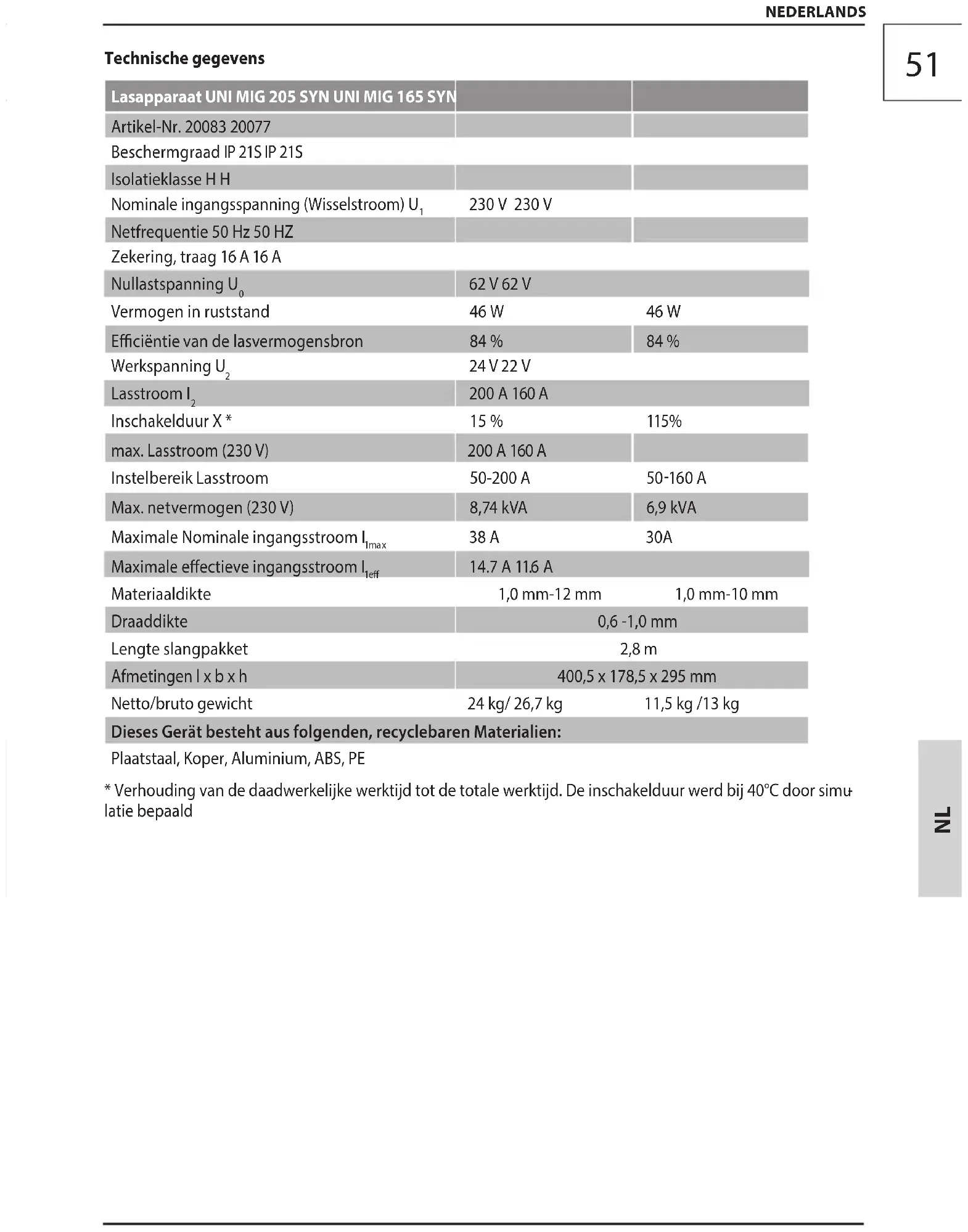 zing, kan de producent voor schaden niet aansprake- lijk gesteld worden. Wij maken u erop attent dat onze installaties qua bestemming niet geconstrueerd zijn voor gebruik in ondernemingen, handwerkateliers of industriële be- drijven. Onder omstandigheden in ondernemingen, handwerkateliers of industriële bedrijven kunnen wij geen garantie verlenen. Veiligheidsadviezen GEVAAR! Stroomschok! Er is letselgevaar door elektrische stroom! Het gebruik is slechts met een fout- stroomschakelaar (RCD max. foutstroom van 30 mA) toegestaan. Het lasapparaat heeft een beveiligingsgraad IP21 en mag nooit aan regen en vocht, tijdens het gebruik of opslag, blootgesteld worden. Spanning controleren. De op het plaatje aangegeven technische gegevens moeten in overeenstemming zijn met de spanning van het stroomnet. Steek de stekker van het netsnoer in een geschikt stopcontact qua vorm, spanning en frequentie, dat aan de geldende wettelijke voorschriften voldoet. Gebruik verlengsnoeren van maximaal 5 meter en met een kabeldoorsnede van niet minder dan 1,5 mm2. Men raadt het gebruik van verlengsnoeren met andere lengte en doorsnede, alsmede van adapters en meervoudige stekkerdozen af. Voor de inbedrijfne