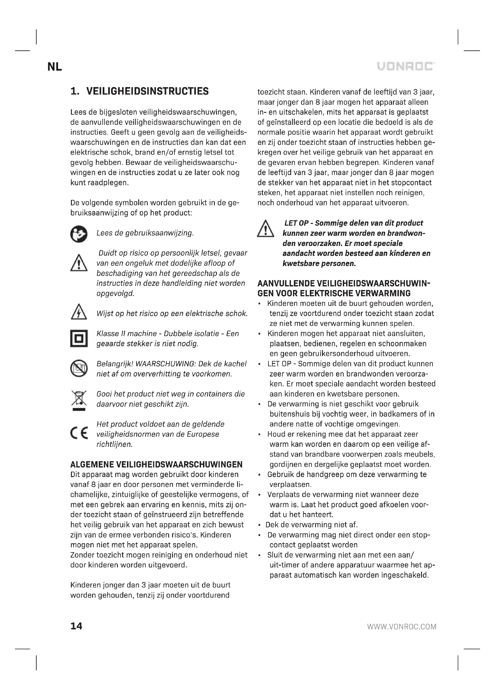 Lees de bijgesloten veiligheidswaarschuwingen, de aanvullende veiligheidswaarschuwingen en de instructies. Geeft u geen gevolg aan de veiligheids- waarschuwingen en de instructies dan kan dat een elektrische schok, brand en/of ernstig letsel tot gevolg hebben. Bewaar de veiligheidswaarschu- wingen en de instructies zodat u ze later ook nog kunt raadplegen. De volgende symbolen worden gebruikt in de ge- bruiksaanwijzing of op het product: Lees de gebruiksaanwijzing. Duidt op risico op persoonlijk letsel, gevaar van een ongeluk met dodelijke afloop of beschadiging van het gereedschap als de instructies in deze handleiding niet worden opgevolgd. Wijst op het risico op een elektrische schok. Klasse II machine - Dubbele isolatie - Een geaarde stekker is niet nodig. Belangrijk! WAARSCHUWING: Dek de kachel niet af om oververhitting te voorkomen. Gooi het product niet weg in containers die daarvoor niet geschikt zijn. Het product voldoet aan de geldende veiligheidsnormen van de Europese richtlijnen. ALGEMENE VEILIGHEIDSWAARSCHUWINGEN Dit apparaat mag worden gebruikt door kinderen vanaf 8 jaar en door personen met verminderde li- chamelijke, zintuiglijke of geestelijke vermogens, of met een gebrek aan ervaring en kennis, mits zij on- der toezicht staan of geïnstrueerd zijn betreffende het veilig gebruik van het apparaat en zich bewust zijn van de ermee verbonden risico’s. Kinderen mogen niet met het apparaat spelen. Zonder toezicht mogen reiniging en onderhoud niet door kinderen worden uitgevoerd. Kinderen jonger dan 3 jaar moeten uit de buurt worden gehouden, tenzij zij onder voortdurend toezicht staan. Kinderen vanaf de leeftijd van 3 jaar, maar jonger dan 8 jaar mogen het apparaat alleen in- en uitschakelen, mits het apparaat is geplaatst of geïnstalleerd op een locatie die bedoeld is als de normale positie waarin het apparaat wordt gebruikt en zij onder toezicht staan of instructies hebben ge- kregen over het veilige gebruik van het apparaat en de gevaren ervan hebben begrepen. Kinderen vanaf de leeftijd van 3 jaar, maar jonger dan 8 jaar mogen de stekker van het apparaat niet in het stopcontact steken, het apparaat niet instellen noch reinigen, noch onderhoud van het apparaat uitvoeren. LET OP - Sommige delen van dit product kunnen zeer warm worden en brandwon- den veroorzaken. Er moet speciale aandacht worden besteed aan kinderen en kwetsbare personen. AANVULLENDE VEILIGHEIDSWAARSCHUWIN-
