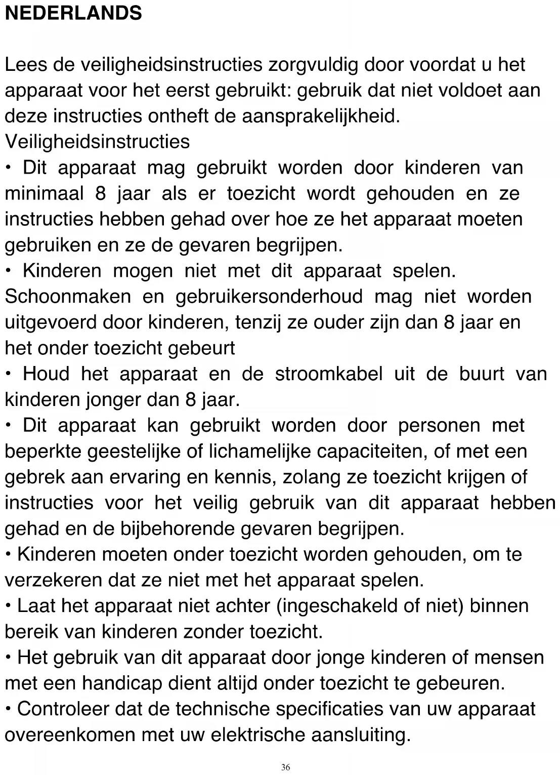 - Dit apparaat mag gebruikt worden door kinderen van minimaal 8 jaar als er toezicht wordt gehouden en ze instructies hebben gehad over hoe ze het apparaat moeten gebruiken en ze de gevaren begrijpen.