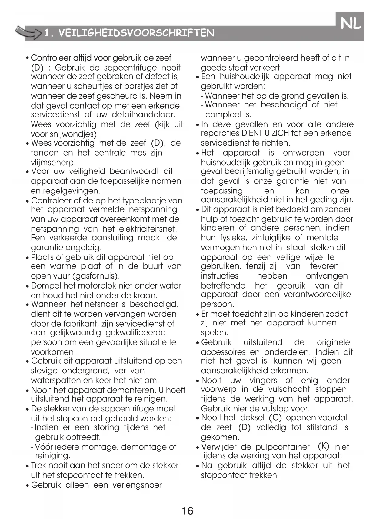 Controleer altijd voor gebruik de zeef (D) : Gebruik de sapcentrifuge nooit wanneer de zeef gebroken of defect is, wanneer u scheurtjes of barstjes ziet of wanneer de zeef gescheurd is. Neem in dat geval contact op met een erkende servicedienst of uw detailhandelaar. Wees voorzichtig met de zeef (kijk uit voor snijwondjes).