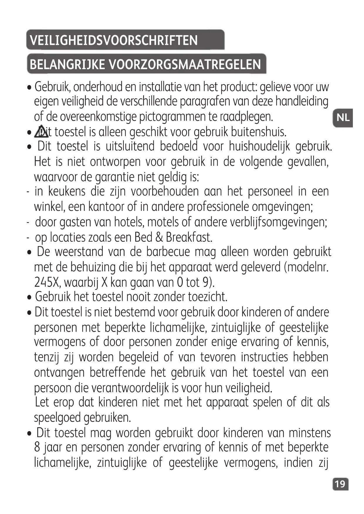 - De weerstand van de barbecue mag alleen worden gebruikt met de behuizing die bij het apparaat werd geleverd (modelnr. 245X, waarbij X kan gaan van 0 tot 9).