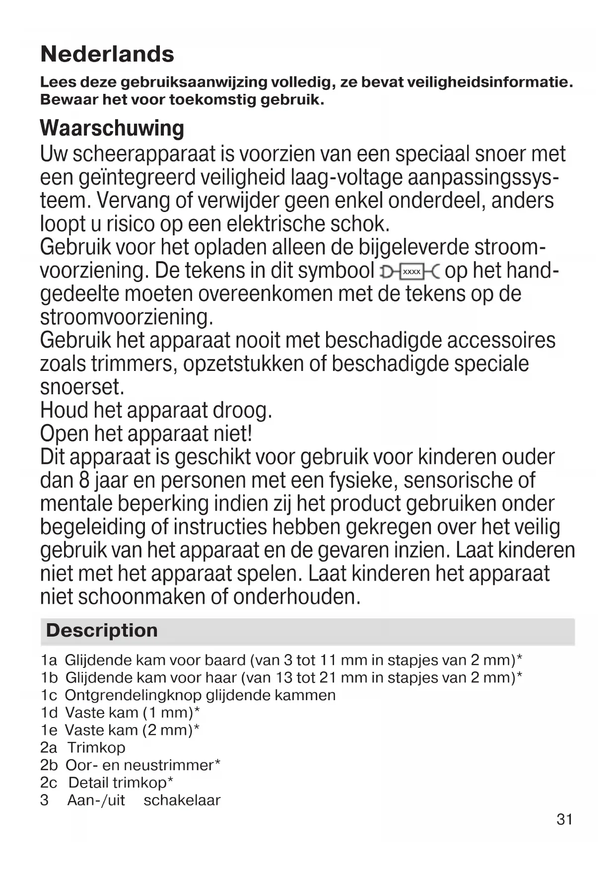 - Zodra het scheerapparaat volledig is opgeladen, gebruik het dan op de normale manier tot het leeg is. Laad het dan weer volledig op. Gebruik Bevestig of verwissel de opzetstukken enkel wanneer het apparaat is uitge- schakeld. Verschuif de aan/uit schakelaar (3) om het apparaat aan te zetten. Baard trimmen / Haar knippen Glijdende kammen (1a, 1b): Plaats één van de kammen op de trimkop (2a). Druk op de ontgrendelingknop (1c) en schuif de kam op gewenste lengte. Vaste kammen (1d, 1e): Plaats één van de kammen op de trimkop (2a).