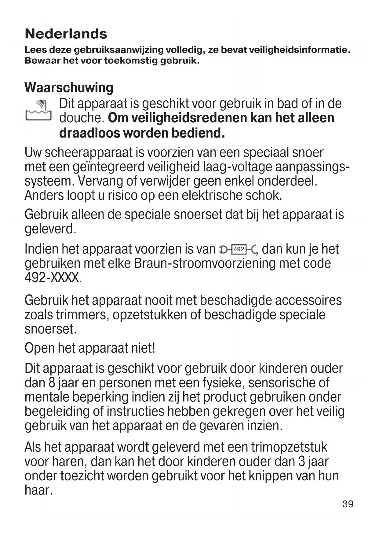 - Smeer de trimmer en het scheerblad regelmatig in met een druppel naaimachineolie (niet inbegrepen) om de prestaties van de opzetstukken optimaal te houden. Mededeling ter bescherming van het milieu Dit product bevat batterijen en/of recyclebaar elektrisch afval. Ter bescherming van het milieu mag dit product niet met het gewone huisvuil worden weggegooid. Verwijdering kan plaatsvinden bij de bekende verzamelplaatsen in uw regio/land. Wijzigingen zonder voorafgaande kennisgeving voorbehouden. Garantie Op dit product verlenen wij een garantie van 2 jaar geldend vanaf datum van aankoop. Binnen de garantieperiode zullen eventuele fabricagefouten en/of materiaalfouten gratis door ons worden verholpen, hetzij door repa- ratie, vervanging van onderdelen of omruilen van het apparaat. 91977969_Type5544_MGK7331_7330_7321_7320_MN_ANZ.indd 4291977969_Type5544_MGK7331_7330_7321_7320_MN_ANZ.indd 42 10.09.21 09:3810.09.21 09:3843 Afhankelijk van beschikbaarheid kan vervanging resulteren in een andere kleur of een vergelijkbaar model. Deze garantie is van toepassing in elk land waar dit apparaat wordt geleverd door Braun of een officieel aangestelde vertegenwoordiger van Braun. Beschadiging ten gevolge van onoordeelkundig gebruik, normale slijtage (bijv. aan scheerblad of messenblok) en gebreken die de werking of waarde van het apparaat niet noemenswaardig beïnvloeden, vallen niet onder de garantie. De garantie vervalt bij reparatie door niet door ons erkende service-afdelingen en/of gebruik van niet originele Braun onderdelen. Om gebruik te maken van onze service binnen de garantieperiode, dient u het complete apparaat met uw aankoopbewijs af te geven of op te sturen naar een geautoriseerd Braun Customer Service Center: www.service. braun.com. Bel 0 800 44 55 388 voor een Braun Customer Service Center bij u in de buurt. 91977969_Type5544_MGK7331_7330_7321_7320_MN_ANZ.indd 4391977969_Type5544_MGK7331_7330_7321_7320_MN_ANZ.indd 43 10.09.21 09:3810.09.21 09:3844 Dansk Læs denne brugervejledning fuldstændigt, da den indeholder sikkerhedsinformation. Behold den til fremtidig reference. Advarsel Dette apparat kan anvendes i badet eller brusebadet. Af sikkerhedsmæssige grunde må dette apparat kun anvendes ledningsfrit. Apparatet er forsynet med en specialledning med integreret strømforsyning og ekstra lav spænding for større sikkerhed. Ingen dele må udskiftes eller manipuleres. I modsat fald risikerer man at få elektrisk stød. Anvend kun specialkablet, der følger med apparatet. Hvis apparatet er mærket med