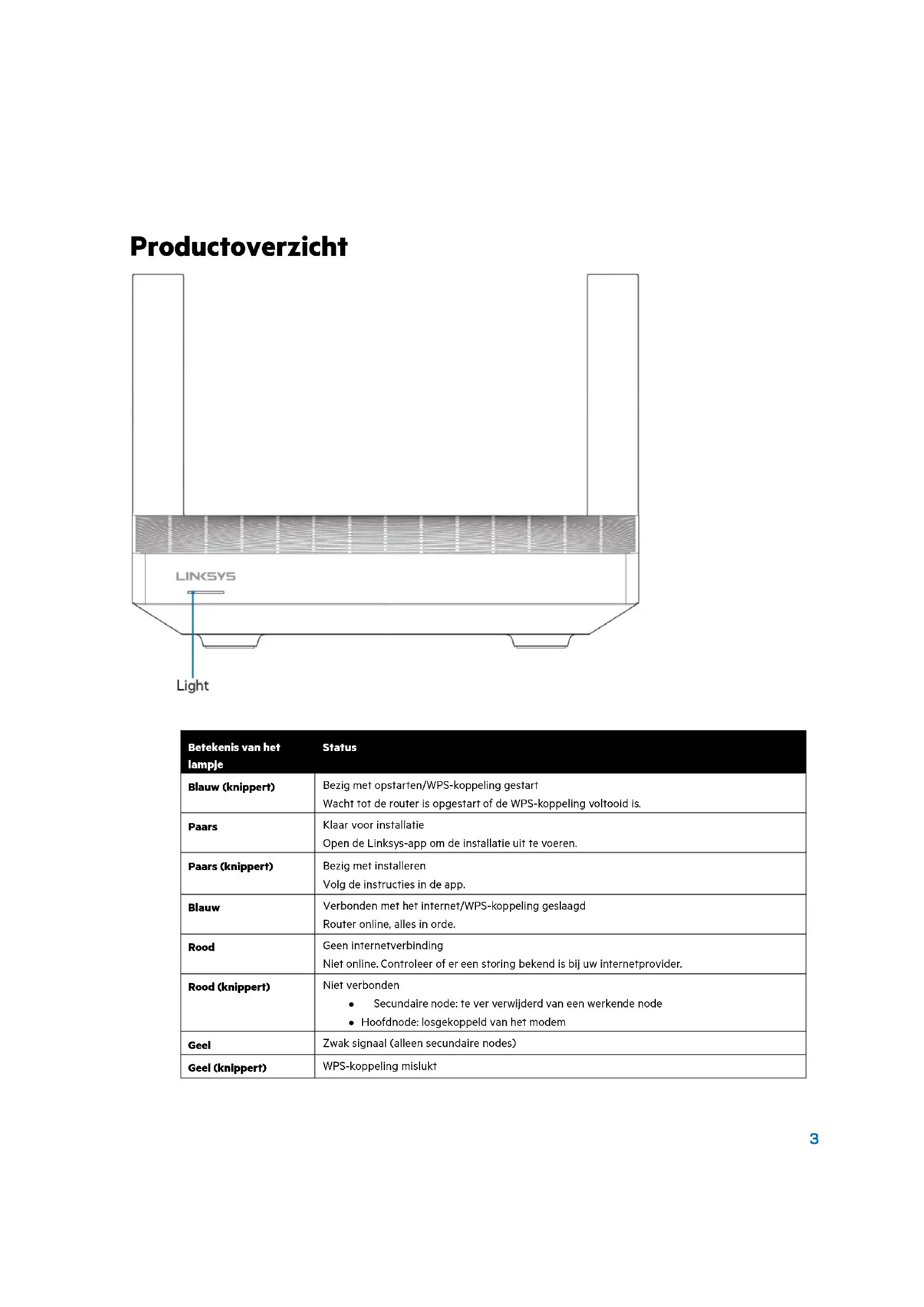 Betekenis van het lampje Status Blauw (knippert) Bezig met opstarten/WPS-koppeling gestart Wacht tot de router is opgestart of de WPS-koppeling voltooid is. Paars Klaar voor installatie Open de Linksys-app om de installatie uit te voeren. Paars (knippert) Bezig met installeren Volg de instructies in de app. Blauw Verbonden met het internet/WPS-koppeling geslaagd Router online, alles in orde. Rood Geen internetverbinding Niet online. Controleer of er een storing bekend is bij uw internetprovider. Rood (knippert) Niet verbonden