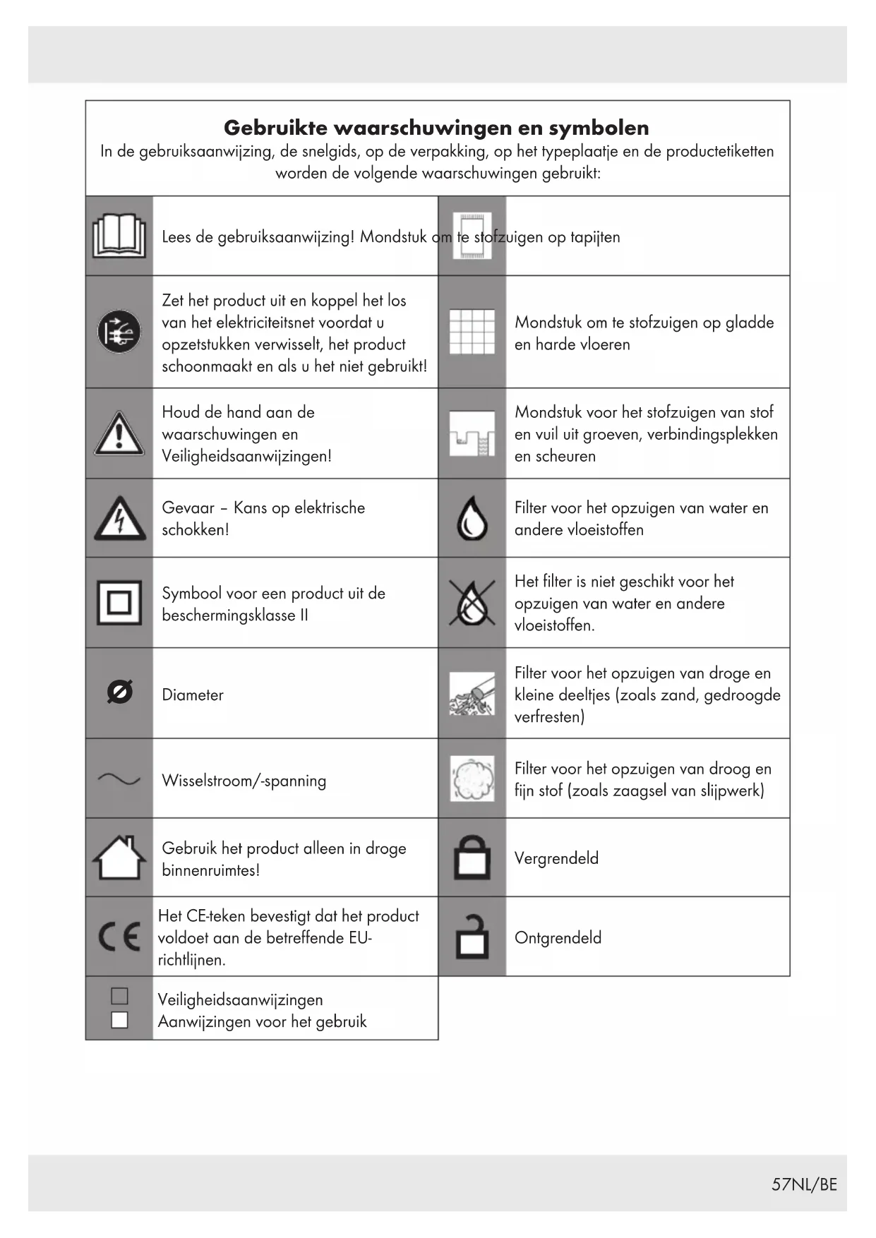 Diameter Filter voor het opzuigen van droge en kleine deeltjes (zoals zand, gedroogde verfresten) Wisselstroom/-spanning Filter voor het opzuigen van droog en fijn stof (zoals zaagsel van slijpwerk) Gebruik het product alleen in droge binnenruimtes! Vergrendeld Het CE-teken bevestigt dat het product voldoet aan de betreffende EU- richtlijnen. Ontgrendeld Veiligheidsaanwijzingen Aanwijzingen voor het gebruik58 NL/BE