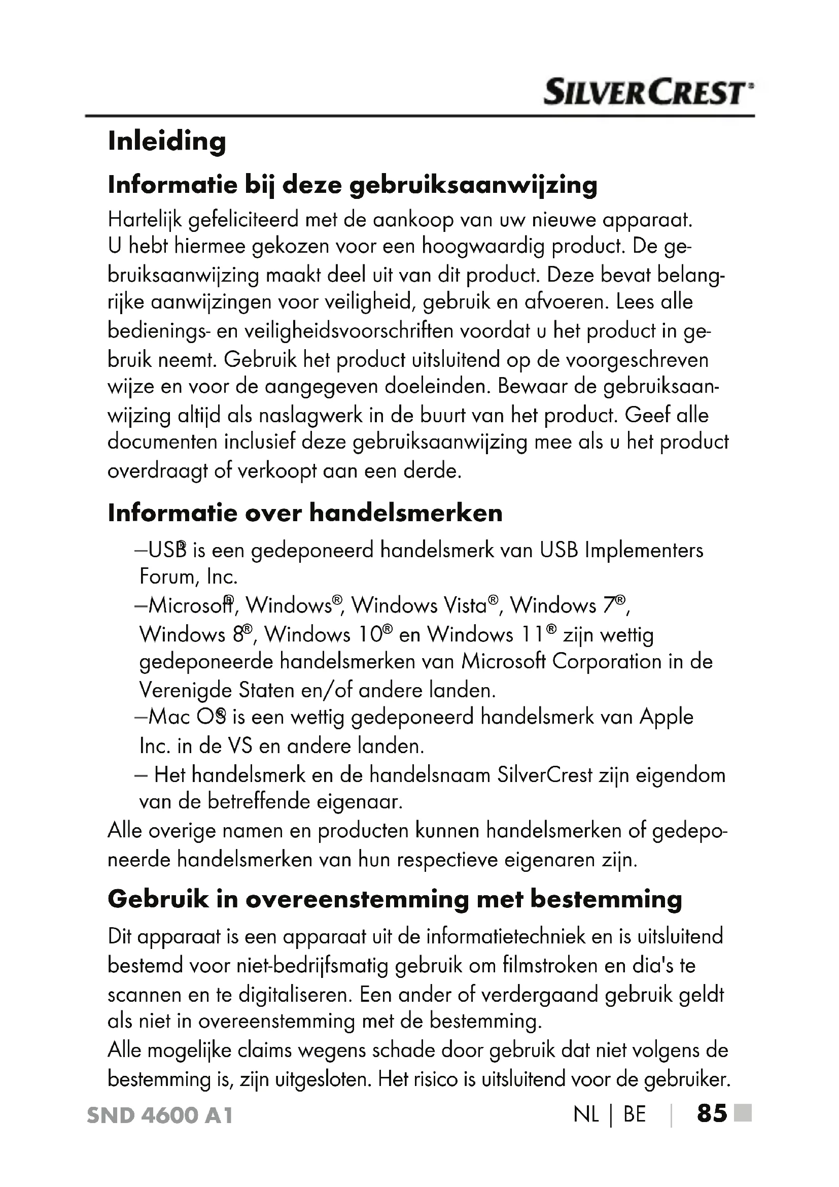 is een wettig gedeponeerd handelsmerk van Apple Inc. in de VS en andere landen. – Het handelsmerk en de handelsnaam SilverCrest zijn eigendom van de betreffende eigenaar. Alle overige namen en producten kunnen handelsmerken of gedepo- neerde handelsmerken van hun respectieve eigenaren zijn. Gebruik in overeenstemming met bestemming Dit apparaat is een apparaat uit de informatietechniek en is uitsluitend bestemd voor niet-bedrijfsmatig gebruik om filmstroken en dia's te scannen en te digitaliseren. Een ander of verdergaand gebruik geldt als niet in overeenstemming met de bestemming. Alle mogelijke claims wegens schade door gebruik dat niet volgens de bestemming is, zijn uitgesloten. Het risico is uitsluitend voor de gebruiker.SND 4600 A1 ■ 86 │ NL│BE Gebruikte waarschuwingen en pictogrammen In deze gebruiksaanwijzing worden de volgende waarschuwingen gebruikt: GEVAAR Een waarschuwing van dit gevaarniveau duidt op een gevaarlijke situatie. Als de gevaarlijke situatie niet wordt vermeden, zal dit ernstig letsel of de dood tot gevolg hebben. ► Neem de aanwijzingen in deze waarschuwing in acht om risico op letsel of de dood te voorkomen. WAARSCHUWING Een waarschuwing van dit gevaarniveau duidt op een mogelijk gevaarlijke situatie. Als de gevaarlijke situatie niet wordt vermeden, kan dit ern- stig letsel of de dood tot gevolg hebben. ► Neem de aanwijzingen in deze waarschuwing in acht om risico op letsel of de dood te voorkomen. VOORZICHTIG Een waarschuwing van dit gevaarniveau duidt op een mogelijk gevaarlijke situatie. Als de gevaarlijke situatie niet wordt vermeden, kan dit letsel tot gevolg hebben. ► Neem de aanwijzingen in deze waarschuwing in acht om letsel te voorkomen.SND 4600 A1 NL│BE │ 87 ■ OPGELET Een waarschuwing van dit gevaarniveau duidt op mogelijke materiële schade. Als de situatie niet wordt vermeden, kan dit materiële schade tot gevolg hebben. ► Neem de aanwijzingen in deze waarschuwing in acht om materiële schade te voorkomen. OPMERKING ► Een opmerking bevat extra informatie die de omgang met het apparaat vergemakkelijkt. Veiligheidsvoorschriften ■ Controleer het apparaat vóór gebruik op zichtbare schade aan de buitenzijde. Gebruik geen apparaat dat beschadigd of gevallen is. ■ Laat, in geval van beschadiging van het snoer of van de aan- sluitingen, deze vervangen door geautoriseerd en vakkundig personeel of door de klantenservice. ■ Dit apparaat mag worden gebruikt door kinderen vanaf 8jaar en door personen met beperkte fysieke, zintuiglijke of geestelijke vermogens of gebrek aan ervaring of kennis, mits ze onder toezicht staan of over het veilige gebruik van het apparaat zijn geïnstrueerd en de daaruit resulterende gevaren hebben begre- pen. Kinderen mogen niet met het apparaat spelen. Kinderen mogen zonder toezicht geen reiniging en gebruikersonderhoud uitvoeren. ■ Laat reparaties aan het apparaat alleen uitvoeren door geauto- riseerde vakbedrijven of door de klantenservice. Ondeskundige reparaties kunnen resulteren in aanzienlijke gevaren voor de gebruiker. Bovendien vervalt dan de garantie.SND 4600 A1 ■ 88 │ NL│BE ■ Probeer niet zelf het apparaat om te bouwen of te modificeren. ■ Bescherm het apparaat tegen vocht en het binnendringen van vloeistoffen. Plaats geen met vloeistoffen gevulde voorwerpen (bijv. vazen) naast het apparaat. ■ Houd het apparaat uit de buurt van open vuur en plaats geen kaarsen op of nabij het apparaat. Zo voorkomt u de verspreiding van brand. ■ Wanneer het apparaat snel van een warme naar een koude of van een koude naar een warme omgeving wordt overgebracht, laat u het 30min. acclimatiseren.