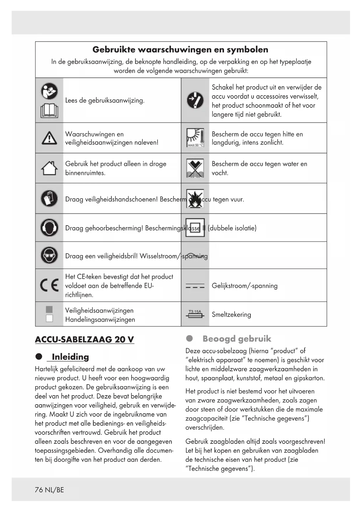Bescherm het product tegen stoten en sterke trillingen, die vooral optreden bij transport in voertuigen. Zeker het product tegen verschuiven en kantelen. Afvoer Verpakking: De verpakking bestaat uit milieuvriendelijke grondstoffen die u via de plaatselijke recyclingcontainers kunt afvoeren. Neem de aanduiding van de verpak- kingsmaterialen voor de afvalscheiding in acht. Deze zijn gemarkeerd met de afkortingen (a) en een cijfers (b) met de volgende betekenis: 1–7: kunst- stoffen/20–22: papier en vezelpla- ten/80–98: composietmaterialen. Product:94 NL/BE Het product, waaronder het toebehoren, en de verpakkingsmaterialen kunnen worden gerecycled en zijn onderhevig aan een uitgebreide verantwoordelijkheid van de fabrikant. Gooi ze apart weg, overeenkomstig de aangegeven Info-tri (informatie over afvalscheiding), voor een beter afvalbeheer. Het Triman-logo geldt alleen voor Frankrijk. Informatie over de mogelijkheden om het uitgediende product na gebruik te verwijderen, verstrekt uw gemeentelijke overheid. Gooi het afgedankte product omwille van het milieu niet weg via het huisvuil, maar geef het af bij het daarvoor bestemde depot of het gemeentelijke milieupark. Over afgifteplaatsen en hun openingstijden kunt u zich bij uw aangewezen instantie informeren. Defecte of verbruikte batterijen/accu‘s moeten volgens de richtlijn 2006/66/EG en veranderingen daarop worden gerecycled. Geef batterijen/accu‘s en/of het product af bij de daarvoor bestemde verzamelstations. Milieuschade door foutieve verwijdering van de batterijen/ accu‘s! Verwijder de batterijen/het accupack uit het product alvorens het af te voeren. Batterijen/accu‘s mogen niet via het huisvuil worden weggegooid. Ze kunnen giftige zware metalen bevatten en vallen onder het chemisch afval. De chemische symbolen van de zware metalen zijn: Cd = cadmium, Hg = kwik, Pb = lood. Geef verbruikte batterijen/accu‘s daarom af bij een gemeentelijk inzamelpunt. Garantie Het product wordt volgens strenge kwaliteitsrichtlijnen zorgvuldig geproduceerd en voor levering grondig getest. In geval van schade aan het product kunt u rechtmatig beroep doen op de verkoper van het product. Deze wettelijke rechten worden door onze hierna vermelde garantie niet beperkt. Op dit product verlenen wij 5 jaar garantie vanaf aankoopdatum. De garantieperiode start op de dag van aankoop. Bewaar de originele kassabon alstublieft. Dit document is nodig als bewijs voor aankoop. Wanneer binnen 5 jaar na de aankoopdatum van dit product een materiaal- of productiefout optreedt, dan wordt het product door ons – naar onze keuze – gratis voor u gerepareerd of vervangen. Deze garantie komt te vervallen als het product beschadigd wordt, niet correct gebruikt of onderhouden wordt. De garantie geldt voor materiaal- en productiefouten. Deze garantie is niet van toepassing op productonderdelen, die onderhevig zijn aan normale slijtage en hierdoor als aan slijtage onderhevige onderdelen gelden (bijv. batterijen) of voor beschadigingen aan breekbare onderdelen, zoals bijv. schakelaars, accu’s of dergelijke onderdelen, die gemaakt zijn van glas. U heeft op de accu een garantie van 1 jaar vanaf de aankoopdatum. Afwikkeling in geval van garantie Om een snelle afhandeling van uw reclamatie te waarborgen dient u de volgende instructies in acht te nemen: Houd bij alle vragen alstublieft de kassabon en het artikelnummer (IAN 391001_2201) als bewijs van aankoop bij de hand. Het artikelnummer vindt u op de typeplaat, ingegraveerd, op het titelblad van uw handleiding (linksonder) of als sticker op de achter- of onderzijde.95NL/BE Wanneer er storingen in de werking of andere gebreken optreden, dient u eerst telefonisch of per e-mail contact met de onderstaande service- afdeling op te nemen. Een als defect geregistreerd product kunt u dan samen met uw aankoopbewijs (kassabon) en vermelding van de concrete schade alsmede het tijdstip van optreden voor u franco aan het u meegedeelde servicepunt verzenden. Service Service Nederland Tel.: 08000225537 E-Mail: owim@lidl.nl Service Belgiё Tel.: 080071011 Tel.: 80023970 (Luxemburg) E-Mail: owim@lidl.be96 NL/BE EG-verklaring van overeenstemming97PL Używane ostrzeżenia i symbole ................................. Strona 99 Wstęp ................................................................ Strona 99 Użytkowanie zgodne z przeznaczeniem..................................... Strona 99 Zakres dostawy ........................................................ Strona 100 Potrzebne (do użytku z aplikacją Lidl Home) ................................. Strona 100 Opis części............................................................ Strona 100 Dane techniczne ....................................................... Strona 100 Uwagi handlowe ....................................................... Strona 102 Instrukcje bezpieczeństwa ........................................ Strona 102 Ogólne instrukcje bezpieczeństwa dla uchwytów elektronarzędzi ................. Strona 102 Instrukcje bezpieczeństwa dotyczące pił szablastych ........................... Strona 105 Redukcja wibracji i hałasu ................................................ Strona 106 Zachowanie w sytuacjach awaryjnych ...................................... Strona 106 Inne zagrożenia........................................................ Strona 107 Instrukcje bezpieczeństwa dla ładowarek .................................... Strona 107 Przed pierwszym użyciem ........................................ Strona 108 Akcesoria ............................................................. Strona 108 Obsługa.............................................................. Strona 108 Wkładanie i wyjmowanie akumulatora ...................................... Strona 108 Sprawdzanie stanu naładowania akumulatora ................................ Strona 108 Ładowanie akumulatora.................................................. Strona 108 Montaż podstawy .........................