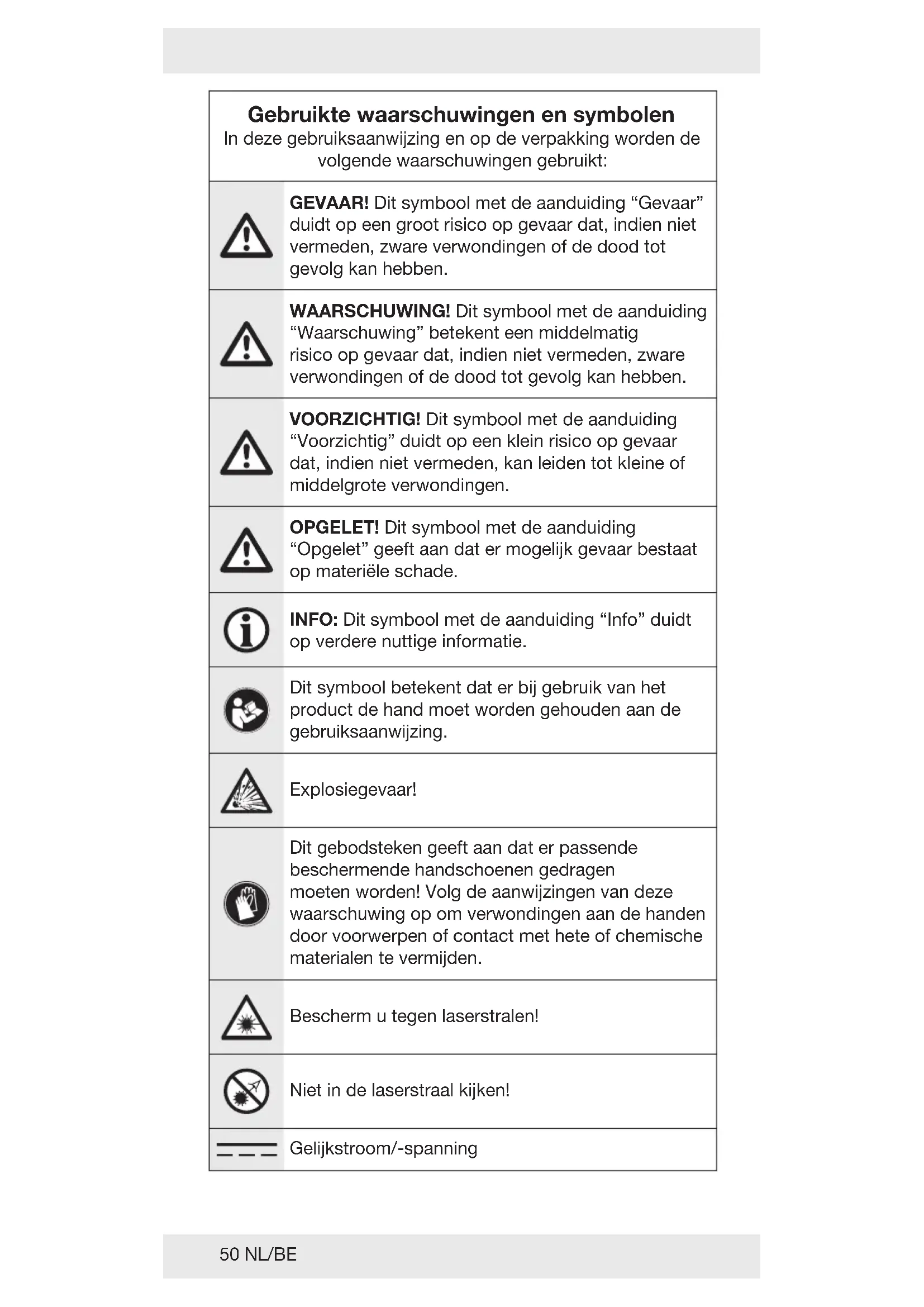 PEUTERS EN KINDEREN! Laat kinderen nooit zonder toezicht achter met het verpakkingsmateriaal. Het verpakkingsmateriaal vormt een verstikkingsgevaar. Kinderen onderschatten vaak de daaraan verbonden gevaren. Houd kinderen altijd uit de buurt van verpakkingsmateriaal. Het product mag alleen door volwassenen worden gebruikt. Kinderen jongr an jaar ogn t rouct alleen gebruiken als ze onder toezicht staan.54 NL/BE Houd kinderen steeds uit de buurt van het product. Algemene instructies ou an aan scicatis in deze gebruiksaanwijzing aangaande bediening, schoonmaken, opslag en verwijdering. Controleer het product voor ieder gebruik. Laat een beschadigd product repareren. Gebruik het product nooit als het is beschadigd. Schakel het product uit als het niet gebruikt wordt. Laat het product nooit zonder toezicht. Houd het product uit de buurt van medische apparatuur, magnetische gegevensdragers en apparaten die gevoelig zijn voor magnetische velden. Werken met een laser WAARSCHUWING! Bescherm u tegen laserstralen!