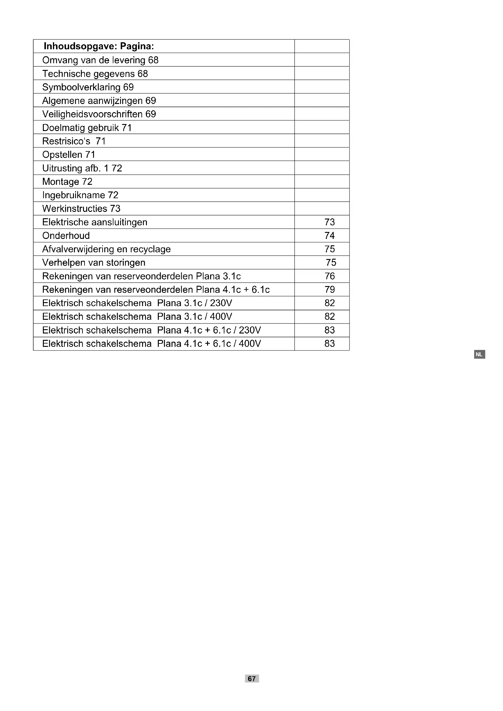 66Inhoudsopgave: Pagina: Omvang van de levering 68 Technische gegevens 68 Symboolverklaring 69 Algemene aanwijzingen 69 Veiligheidsvoorschriften 69 Doelmatig gebruik 71 Restrisico‘s 71 Opstellen 71 Uitrusting afb. 1 72 Montage 72 Ingebruikname 72 Werkinstructies 73 Elektrische aansluitingen 73 Onderhoud 74 Afvalverwijdering en recyclage 75 Verhelpen van storingen 75 Rekeningen van reserveonderdelen Plana 3.1c 76 Rekeningen van reserveonderdelen Plana 4.1c + 6.1c 79 Elektrisch schakelschema Plana 3.1c / 230V 82 Elektrisch schakelschema Plana 3.1c / 400V 82 Elektrisch schakelschema Plana 4.1c + 6.1c / 230V 83 Elektrisch schakelschema Plana 4.1c + 6.1c / 400V 83