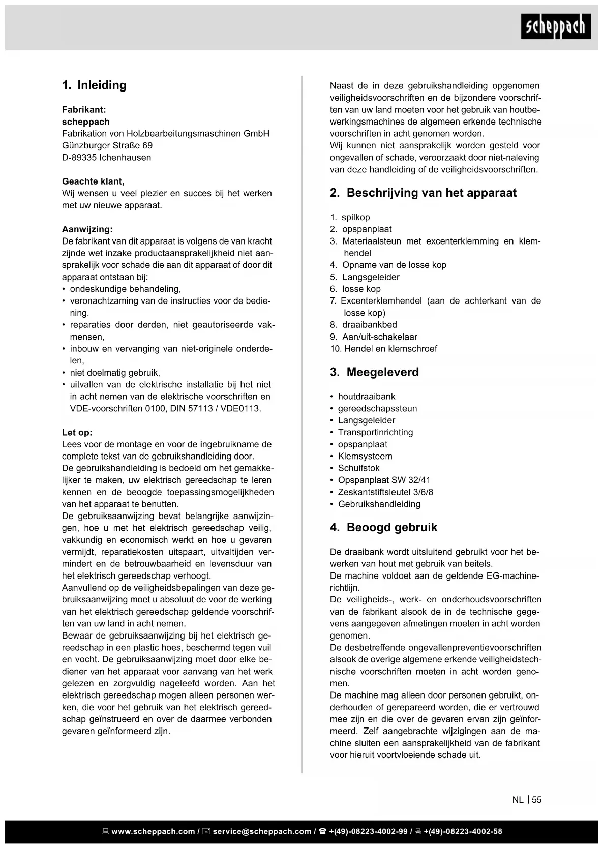 Fabrikant: scheppach Fabrikation von Holzbearbeitungsmaschinen GmbH Günzburger Straße 69 D-89335 Ichenhausen Geachte klant, Wij wensen u veel plezier en succes bij het werken met uw nieuwe apparaat. Aanwijzing: De fabrikant van dit apparaat is volgens de van kracht zijnde wet inzake productaansprakelijkheid niet aan- sprakelijk voor schade die aan dit apparaat of door dit apparaat ontstaan bij: