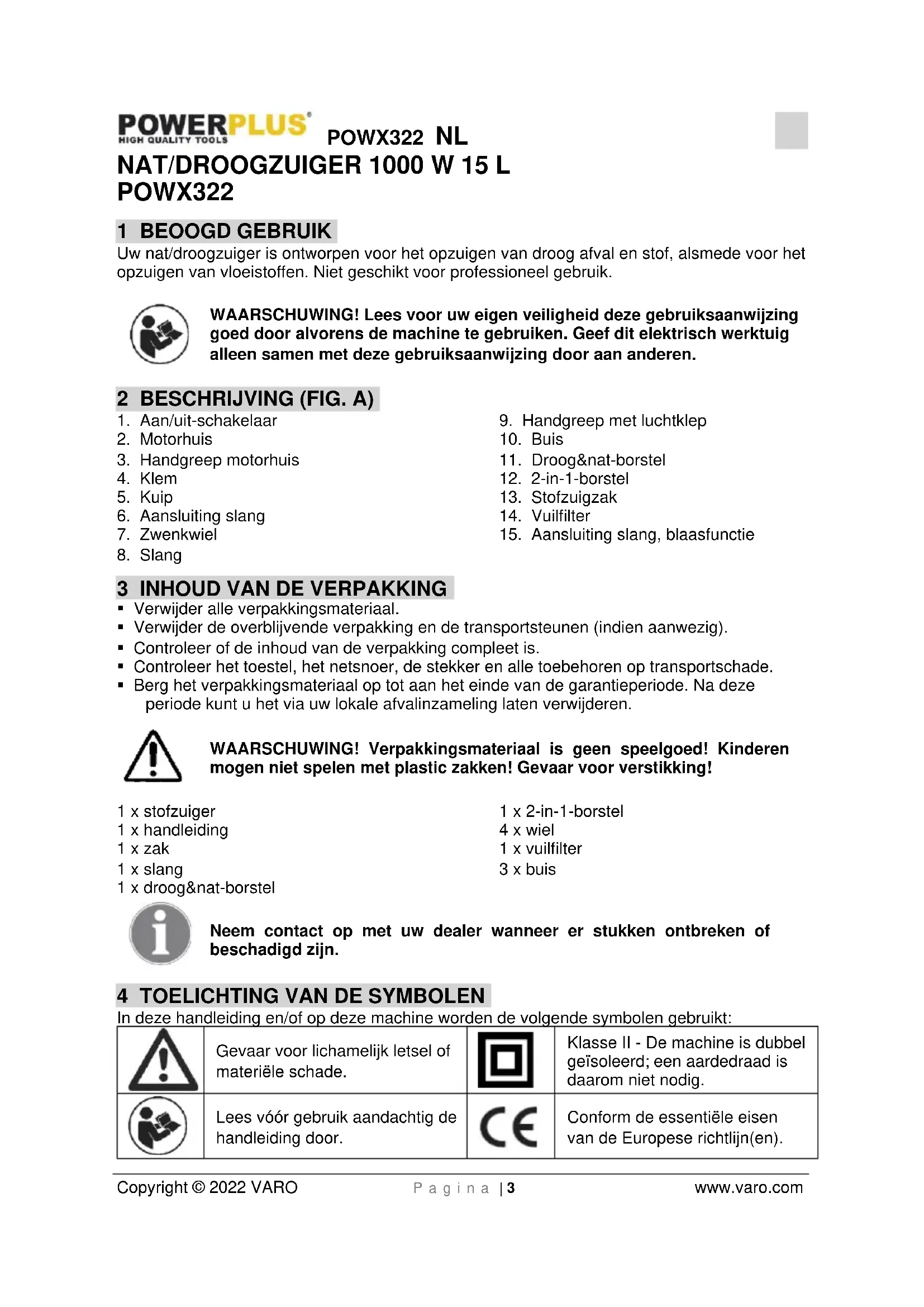 - Uw gereedschap moet als geheel naar uw dealer worden teruggebracht in een aanvaardbare staat van netheid, in zijn originele kunststof koffer (indien van toepassing op het product) en het moet vergezeld zijn van uw bewijs van aankoop. 14 MILIEU Indien u, na zekere tijd, beslist uw machine te vervangen, werp deze dan niet weg bij uw huishoudelijk afval maar doe dit op een milieuvriendelijke wijze. Het elektrisch afval mag niet op dezelfde manier behandeld worden als het gewone huishoudelijke afval. Breng het naar een recyclagecentrum op plaatsen waar zulke gepaste installaties bestaan. Raadpleeg de plaatselijke instanties of de verkoper voor adviezen over inzameling en verwerking.POWX322 NL Copyright © 2022 VARO P a g i n a | 10 www.varo.com 15 CONFORMITEITSVERKLARING VARO N.V. - Vic. Van Rompuy N.V.- Joseph Van Instraat 9 - BE2500 Lier - BELGIUM, verklaart dat, Product: Nat/Droogzuiger Handelsmerk: POWERplus Model: POWX322 voldoet aan de essentiële eisen en aan de overige relevante bepalingen van de van toepassing zijnde Europese Richtlijnen, gebaseerd op de toepassing van Europese geharmoniseerde normen. Elke niet-toegelaten modificatie van het apparaat maakt deze verklaring nietig. Europese Richtlijnen (inclusief, indien van toepassing, hun wijzigingen tot op de datum van ondertekening): 2011/65/EU 2014/30/EU 2014/33/EU Europese geharmoniseerde normen (inclusief, indien van toepassing, hun wijzigingen tot op de datum van ondertekening): EN60335-1 : 2012 EN60335-2-2 : 2010 EN55014-1 : 2017 EN55014-2 : 2015